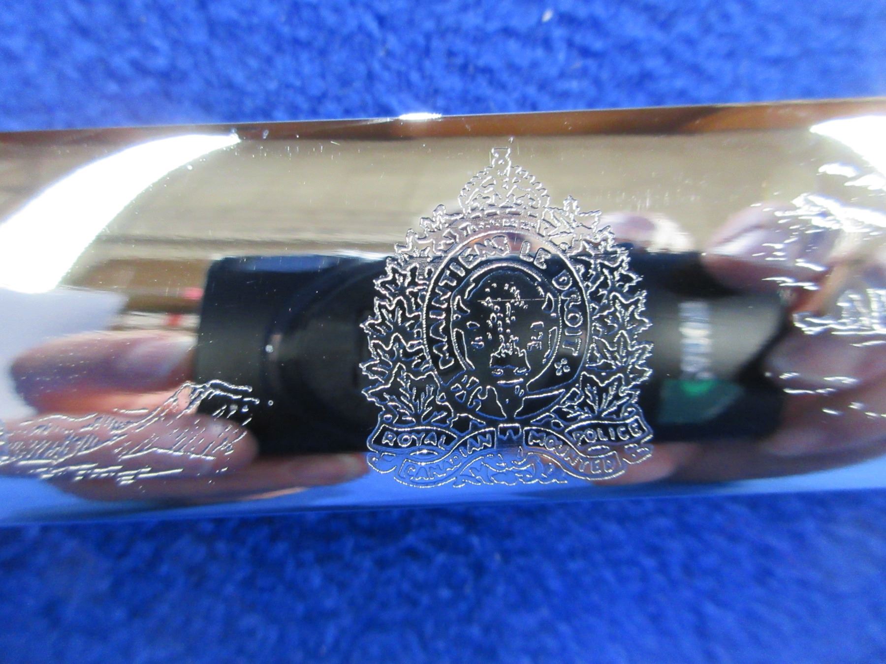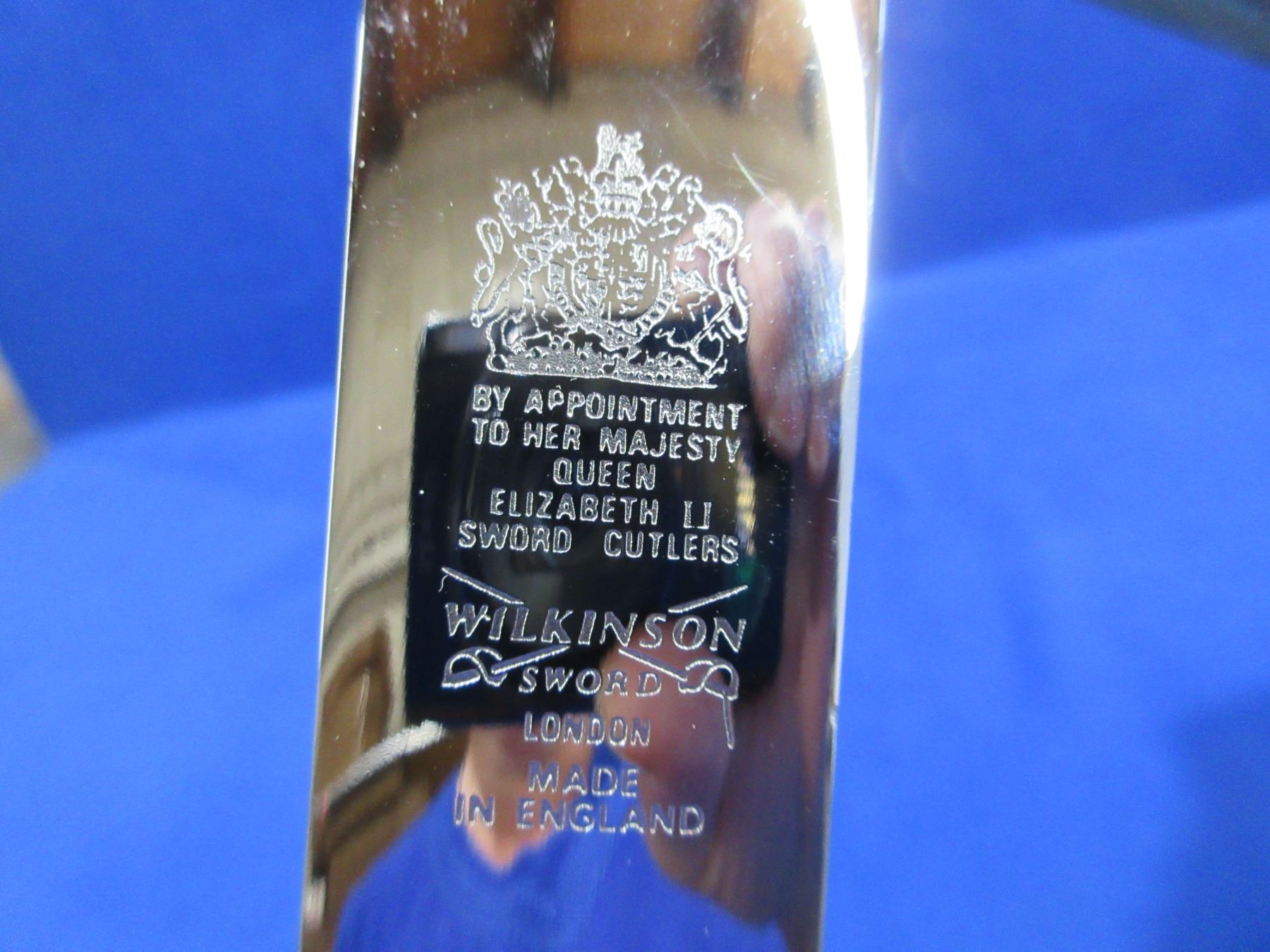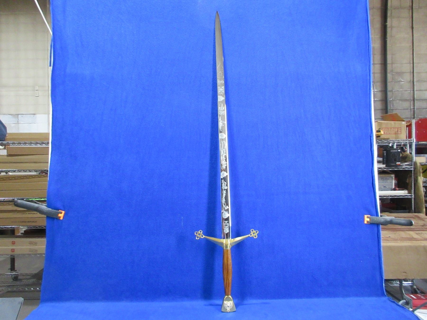 North West Mounted Police Presentation Sword by Wilkinson Sword - This sword was produced to commemorate the centennial of its creation in 1973. Produced by Wilkinson of London, the attractive and weighty keepsake features a beautifully etched blade with 18 carat gold-plated guard, pommel and quillons. Finished with a solid rosewood handle and engraved images including the march west of the original recruits, along with the four historical RCMP crests. Blade is 34", overall length 43 1/4". Ser #C0743