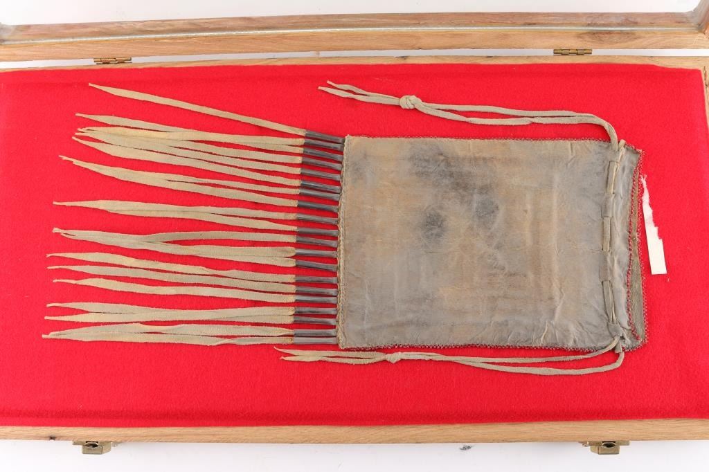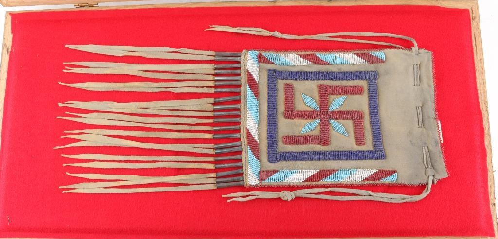 Leather bag with fringe, rolling good luck symbol motif in red, white and blue beads. Overall excellent condition. Measures 18"x6", including fringe.