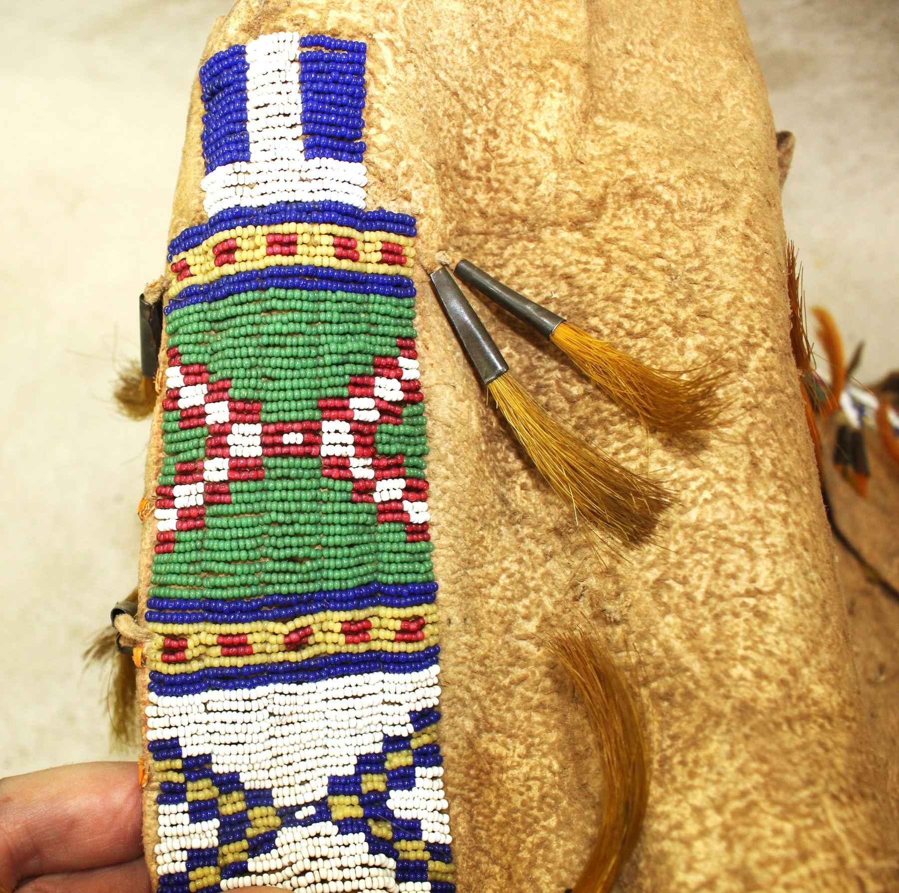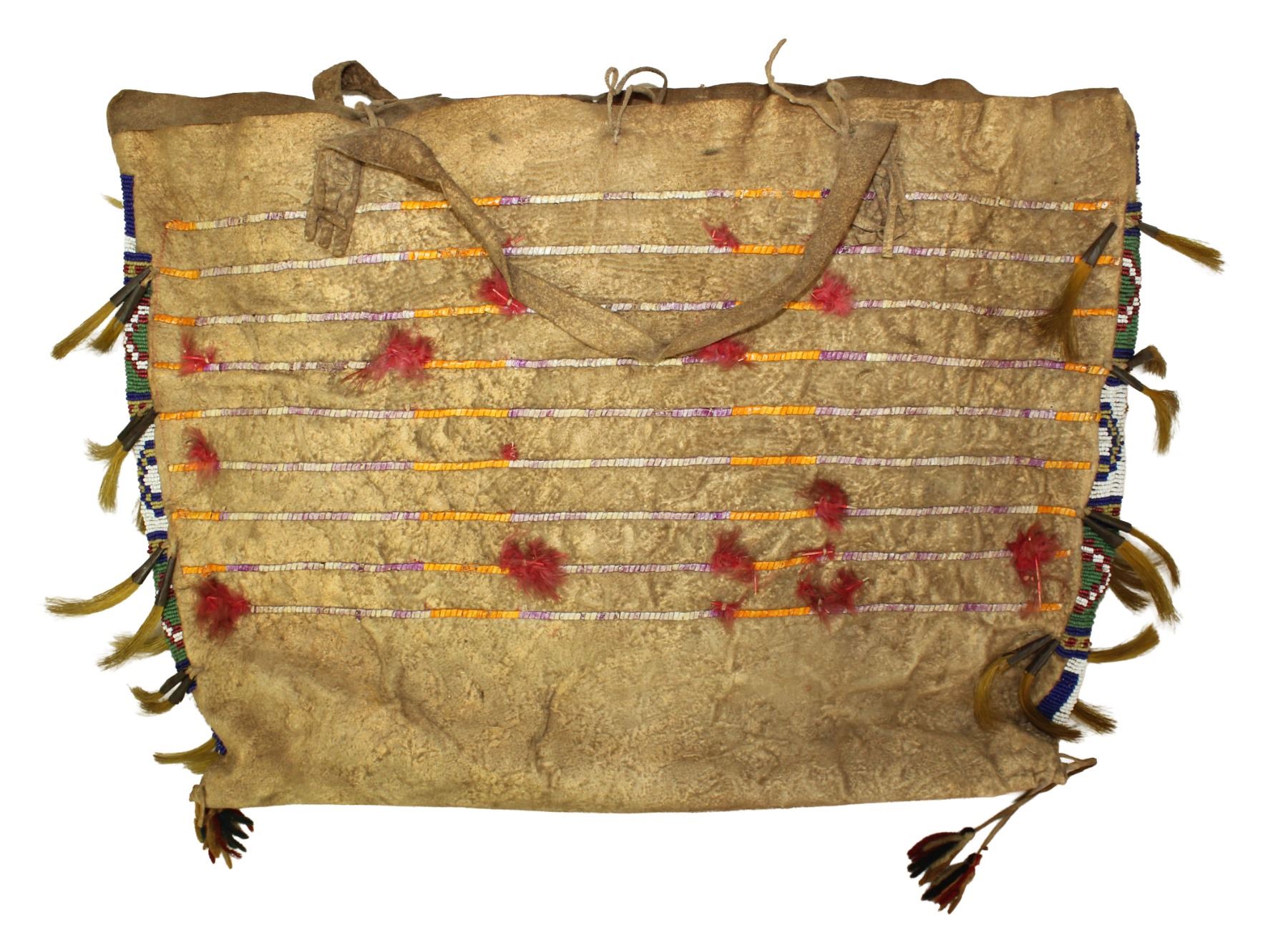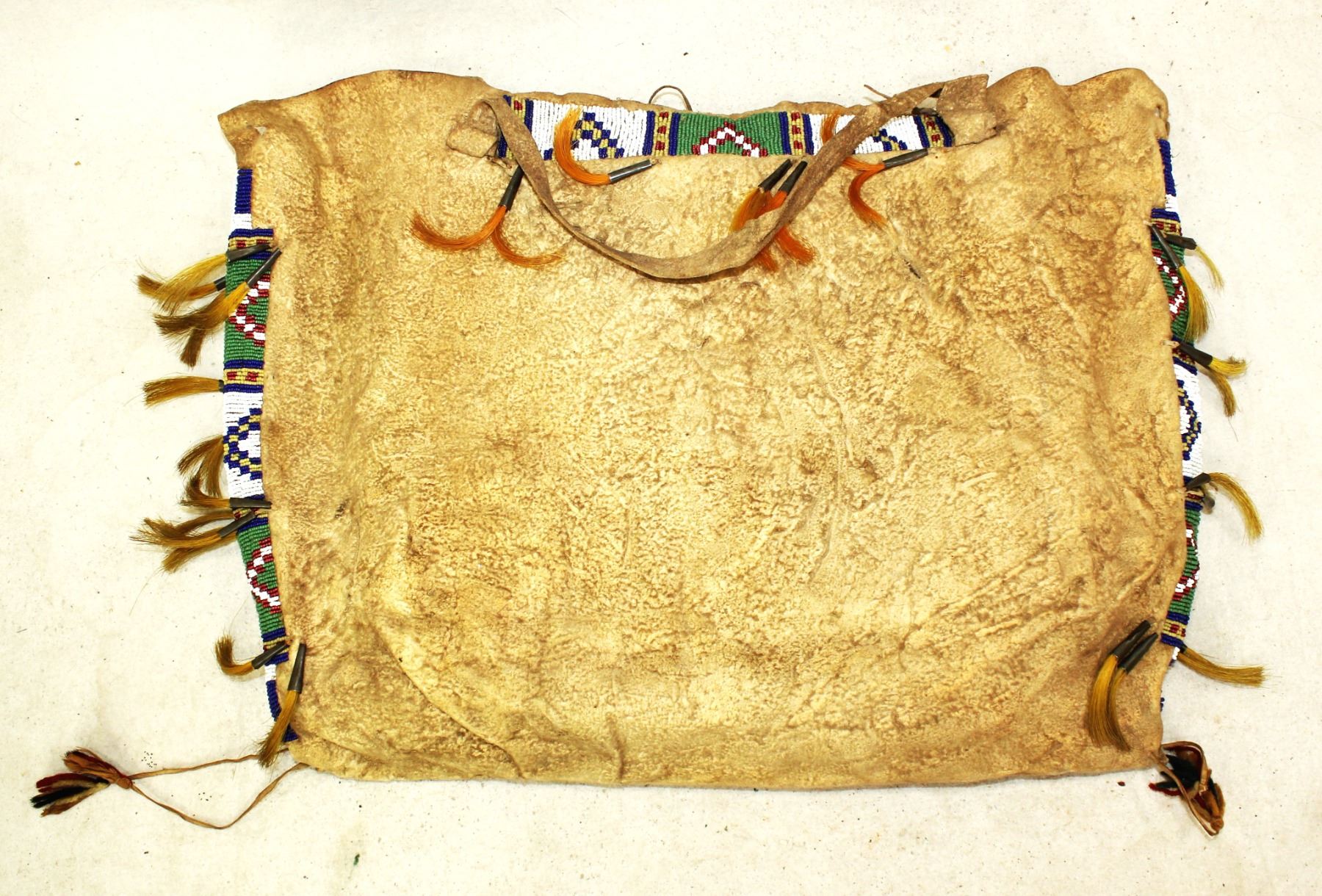 Nicely patinaed 19th century Sioux Indian hide possible bag with banded quill design, highlighted by attractively beaded ends and tinkle cones. Measuring 17"x 15".