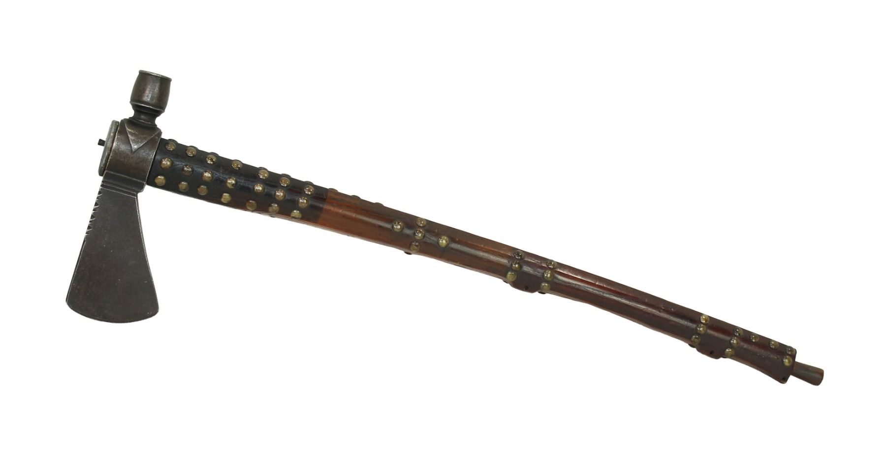 Fabulous Native American pipe tomahawk with pleasing iron head, clean-out in end, and highlighted with a highly detailed tacked and branded haft that shows wonderful color and patina.