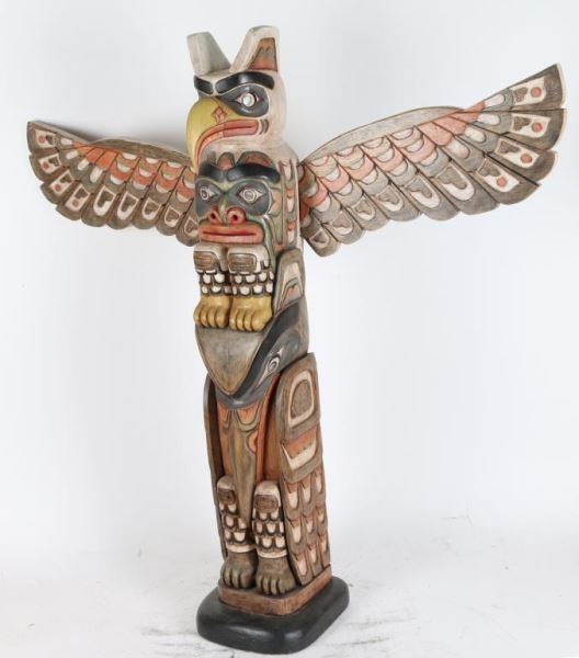 42"T by 46", all hand carved bird warrior with abalone eyes. Wings and nose come off.