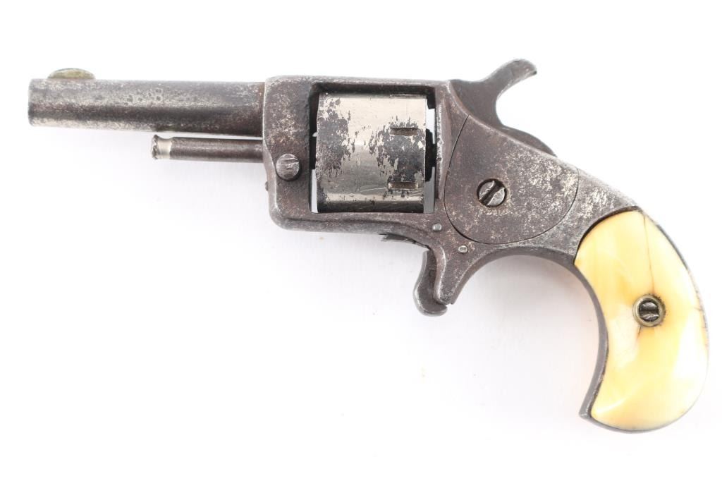 SN: 024. Single action 7 shot spur trigger pocket revolver chambered in .22 Short circa 1870-1880. 2.25" barrel, nickel plated finish, half moon blade front sight, non-fluted seven-shot cylinder, checkered spur trigger, checkered hammer spur and smooth two-piece ivory bird's head grips. Revolver retains about 25% of it's nickel plated finish, mostly on the cylinder, with the rest turned a dark patina, scattered pitting. The hammer/sear engagement is sound, the cylinder does not index, bore is dark/pitted. Ivory grips have a nice yellow patina, there is crack in the left panel.
