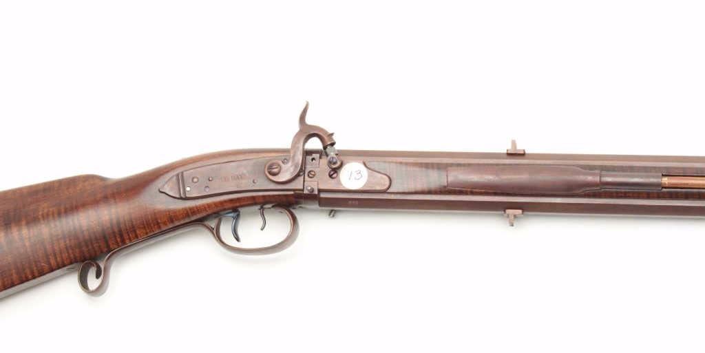 O/U reproduction percussion rifle marked L. Day, approximately .52 caliber over .34 caliber. The rifle is in very good condition with 32” octagon barrels. The barrel and action retain the majority of their brownfinish. A full length cleaning rod is side mounted on the rifle. The rifle features the ability to rotate the barrel depending on your preference and has two sets of sights for the purpose. The smooth wood stock is in very good condition with extraordinary fiddle back walnut showing great grain and stylized cheek piece. The butt ends with a smooth metal crescent butt plate showing moderate rust due to poor storage. Thecraftsmanship evident on this older reproduction is amazing and would no doubt be prohibitively expensive to reproduce at today’s rates. Est.: $600-$1,200.