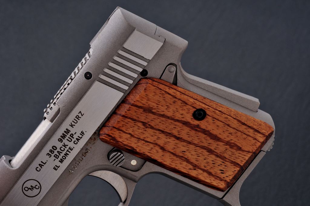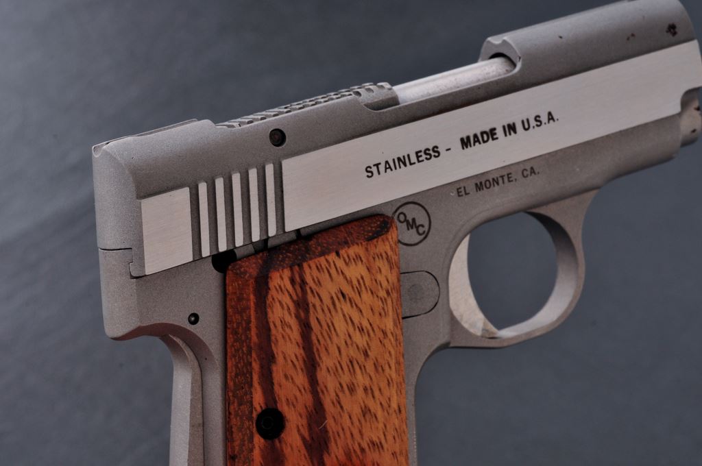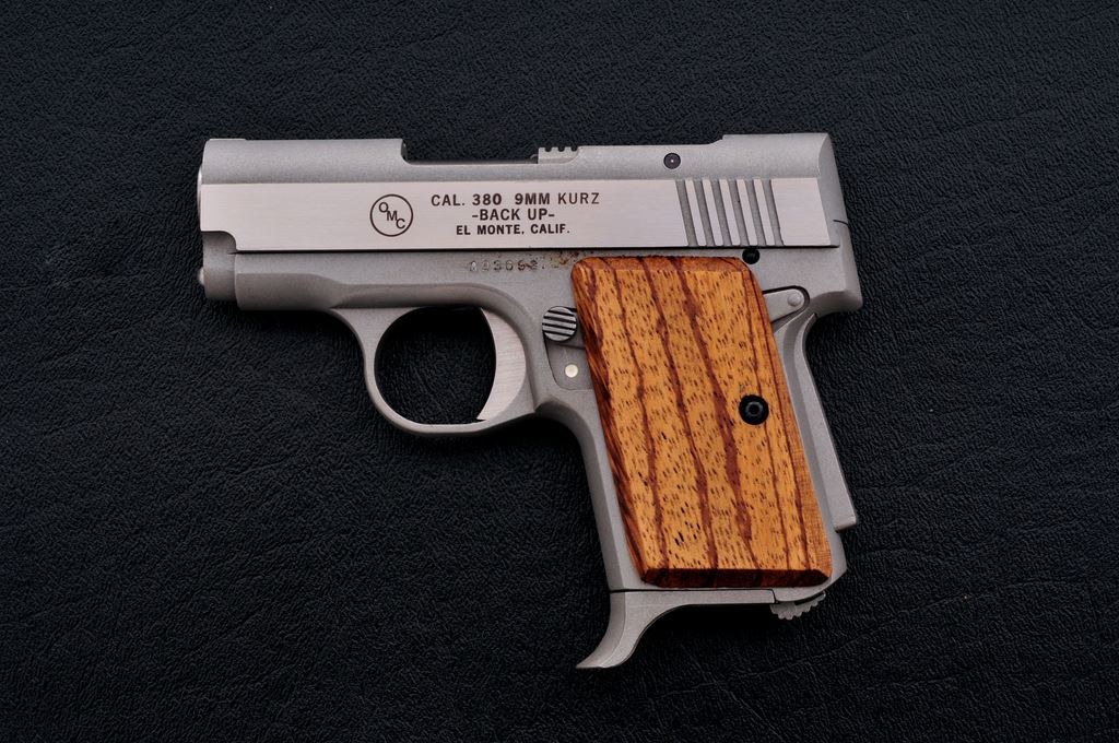 OMC Back-Up Semi-Automatic Pistol, #A03698, .380 ACP cal., 2-5/8'' barrel, stainless steel, smooth wood grips, standard integral sights, grip safety, with one finger extension magazine. In correct box that is hand numbered to the gun with the parts diagram and other paperwork. Pistol with a few tiny spots of exterior surface rust and light surface rust to the edge of the barrel at the chamber, otherwise showing only normal light handling marks. Inside lower edge of the left grip with a small sliver missing (detracts little). Action is smooth and tight with a very good bore. Box shows moderate age and wear. Est.: $200-$350. (Modern/PPT)