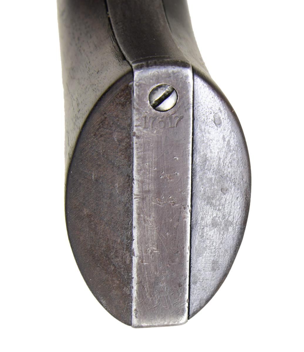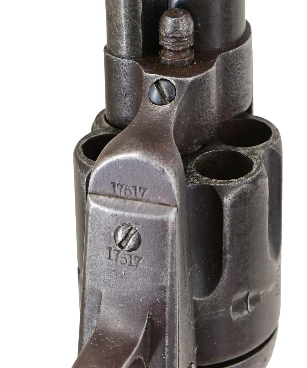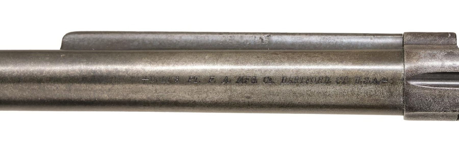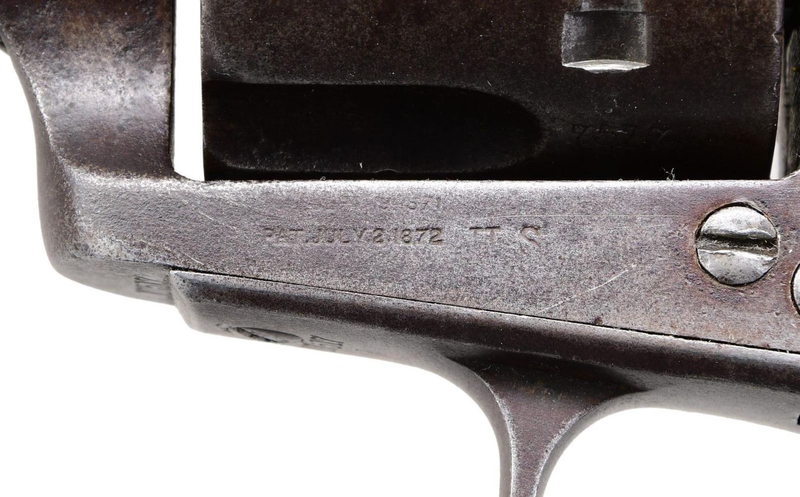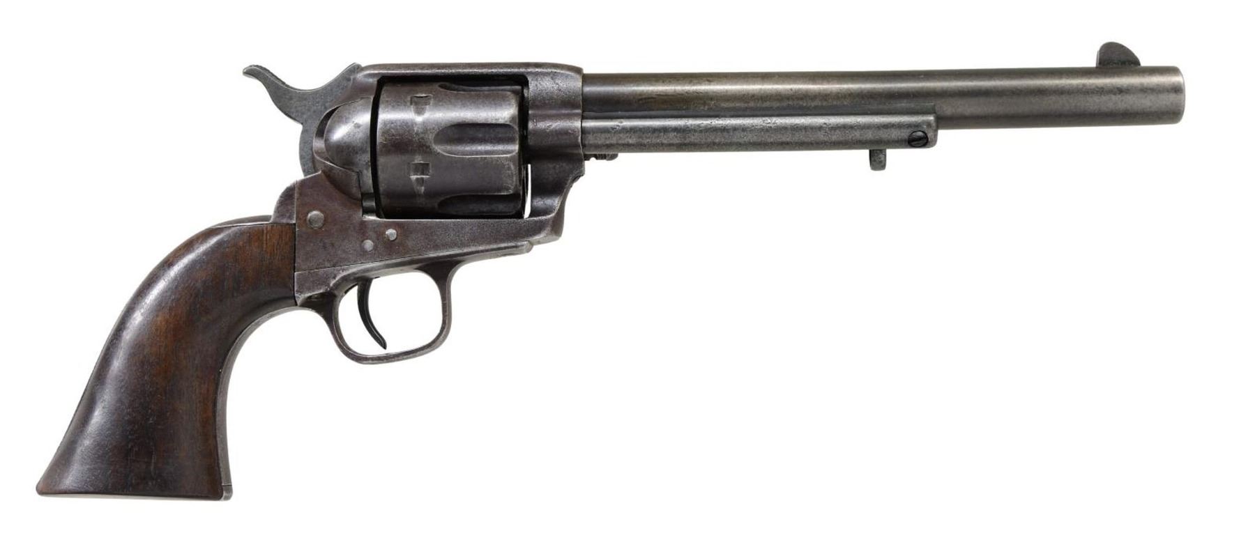 Cal. 45 Colt. S# 17517. Bbl. 7 1/2" with blade front sight. Mfg. 1875. As noted in "A STUDY OF THE COLD SINGLE ACTION ARMY REVOLVER" by Graham, Kopec & Moore, "The U.S. Colt Single Action revolvers manufactured in 1875 are among the most interesting, and least known U.S. Colt Cavalry revolvers. There were three U.S. Ordnance Principal Sub-inspectors who inspected these revolvers at the Colt factory." The two known inspectors are identified as A.P. Casey & Samuel B. Lewis while the third, unknown, is recognized as using a tiny single "J" initial. Trigger guard, cyl & bbl. all bear this initial "J", with bbl. also having small initial "P". Hammer slot marked "C". Matching numbers on frame, grip frame, cyl. & bbl. 1 Piece walnut grips with faintly visible "APC" cartouche on left side. 1 line Italic bbl. address. 2 Line patent date on left side of frame followed by "US". CONDITION: metal has turned gray with an even brown patina. Frame & ejector rod housing exhibit areas of cleaned pitting. Cyl. pin retaining screw appears replacement. Grips appear to have been lightly sanded & refinished with cartouche still lightly visible. Bore shoes even light pitting with strong rifling. All 4 clicks present, last notch is weak and barely holds. (01-25341/BH). ANTIQUE. $8,000-10,000.
