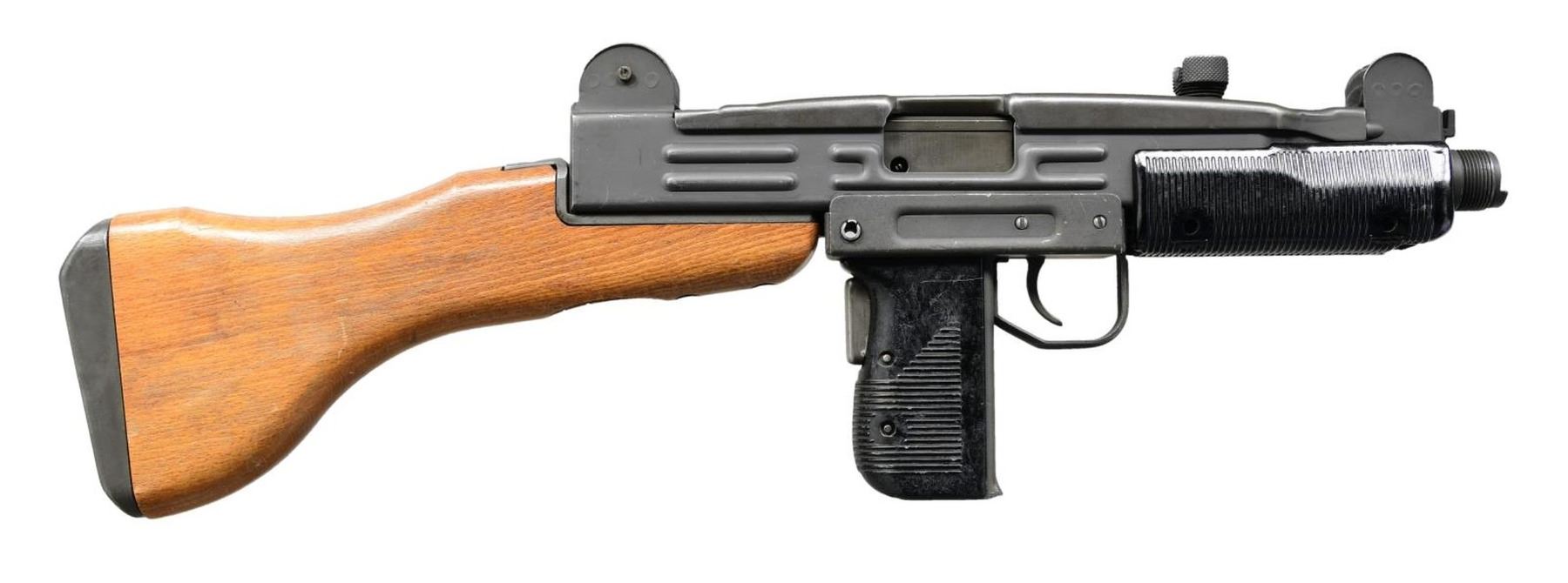 (KEEPER) SUBMACHINE GUN WITH COMPANION SHOOTING SOUND SUPPRESSOR. Cal. 9mm Para. S# 070155 (Uzi) / SP1327 (Suppressor). An original IMI UZI SMG imported by Interarms of Alexandria, VA. Open bolt, select fire mechanism, that is light years ahead of its technology when it comes to use. The Uzi barrel only appears to be a couple inches in length which greatly minimizes its signature for use in tight quarters, but because of the ingenious design, it actually extends back inside of the bolt giving the operator over 10 inches of rifled barrel to increase hit probability immensely. Those that are familiar w/ the 1911 family of firearms will appreciate the grip safety integrated into the mechanism. This particular example has black plastic furniture. Bottom front mounted bayonet lug. Sling swivels on left side of receiver & QD wooden stock. Elevation adj. protected post front sight. Dual aperture rear peep sight. Left side safety / selector markings in Hebrew above safety/selector. Left rear receiver markings include: "S.M.G. / IMI" w/ serial number. Also includes a Companion Shooting Model 2000 Sound Suppressor measuring 12.75" in length, including barrel nut. CONDITION: all exposed metal surfaces retain their factory finish w/ some thinning on high spots & in areas of mechanical intervention. Hardwood stock is light stained with only a few small impressions, & the metal butt plate has some light thinning associated with sling swivel contact. Black plastic furniture has some typical period marring & appears to remain structurally excellent. No barrel present. Fire control mechanism appears to function correctly when cycled by hand. PRE-86 DEALER SAMPLE (KEEPER). NATIONAL FIREARMS ACT MG REQUIRING BATF TRANSFER BEFORE TAKING POSSESSION. YOU MUST BE A CURRENT NFA / SOT DEALER IN ORDER TO TAKE POSESSION OF THIS FIREARM. (03-1703 & 03-1748/JZ). MODERN CLASS III. $4,000-6,000.