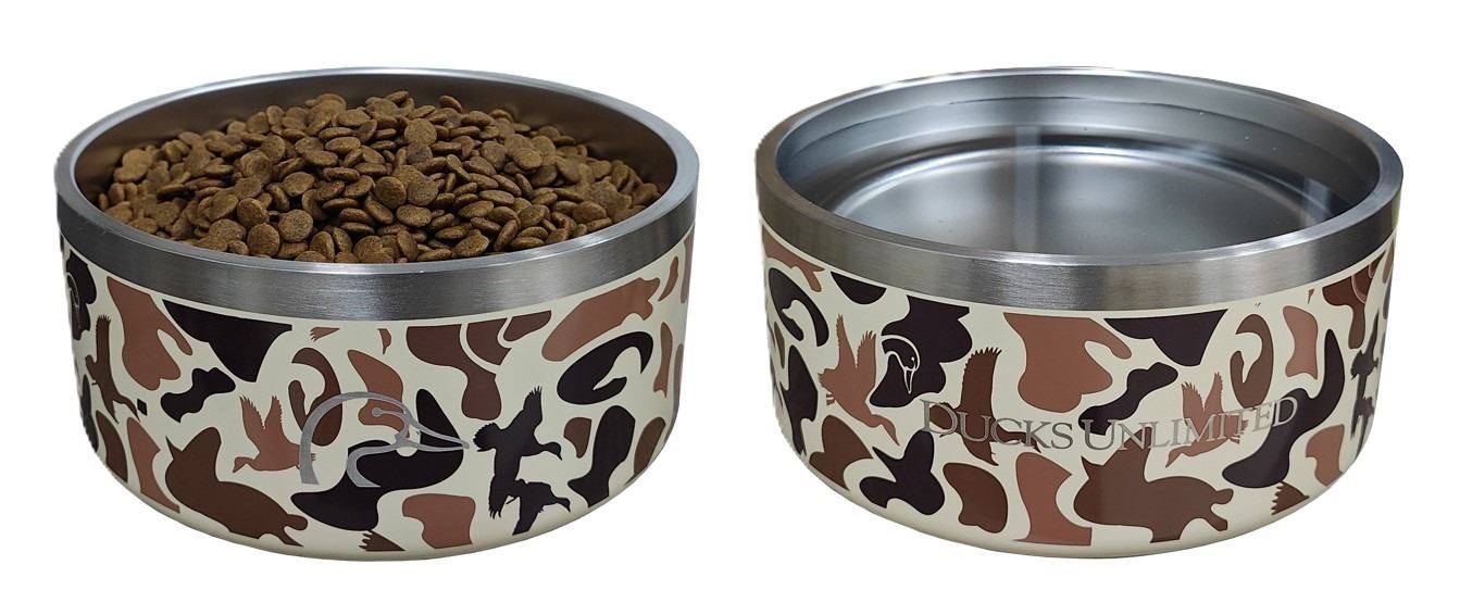 Stainless steel, double-walled construction makes this set of dog bowls both durable and practical, while the DU Old School Camo pattern adds a distinctive outdoor touch. One bowl is laser engraved with “Ducks Unlimited” and the other showcases the iconic DU duckhead logo, creating a coordinated set. Designed with a non-slip bottom for stability, each bowl holds up to 8 cups, making them ideal for mealtime at home or in the field.