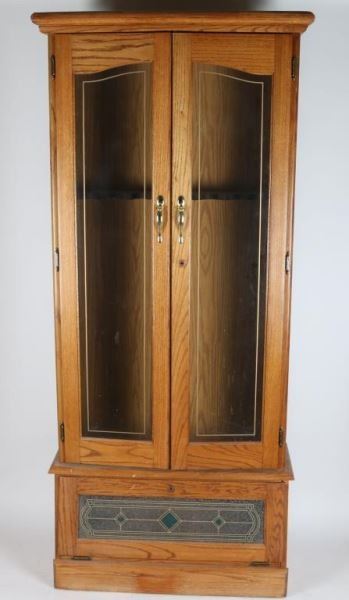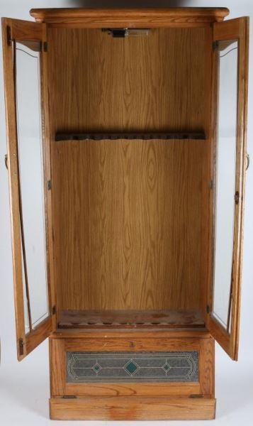 with glass front, holds 8 long guns with a lower section for handguns or ammo. Brass furniture, 70-1/2"Hx28"x10". In overall good condition.
