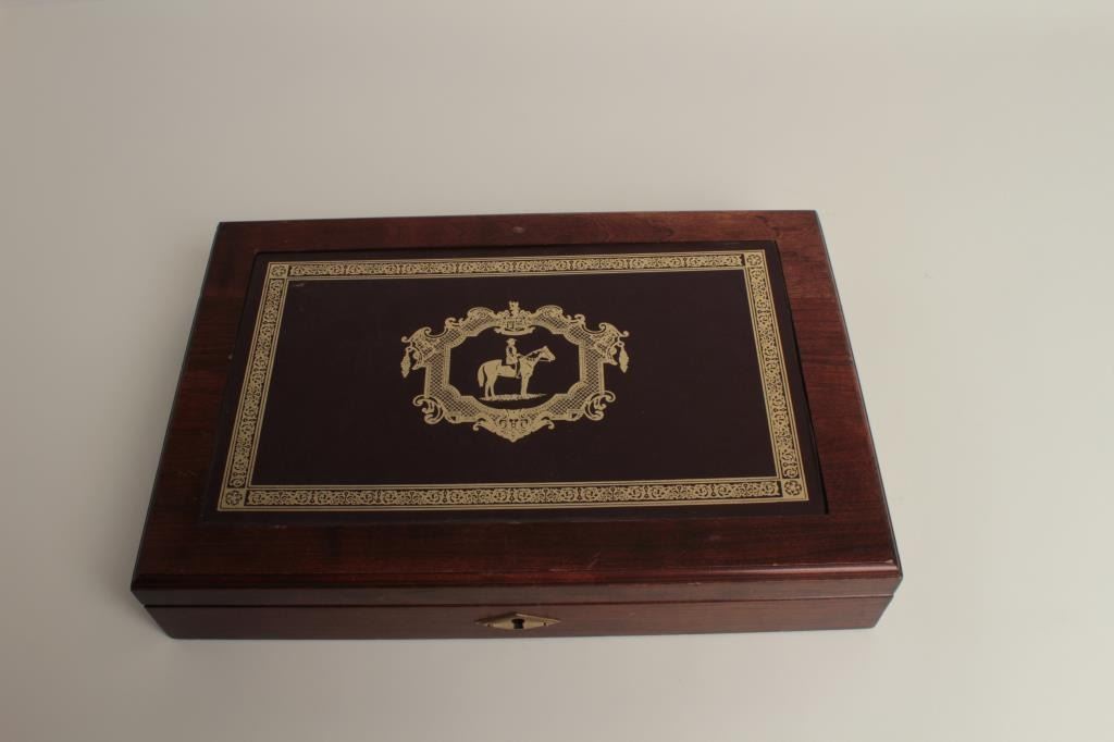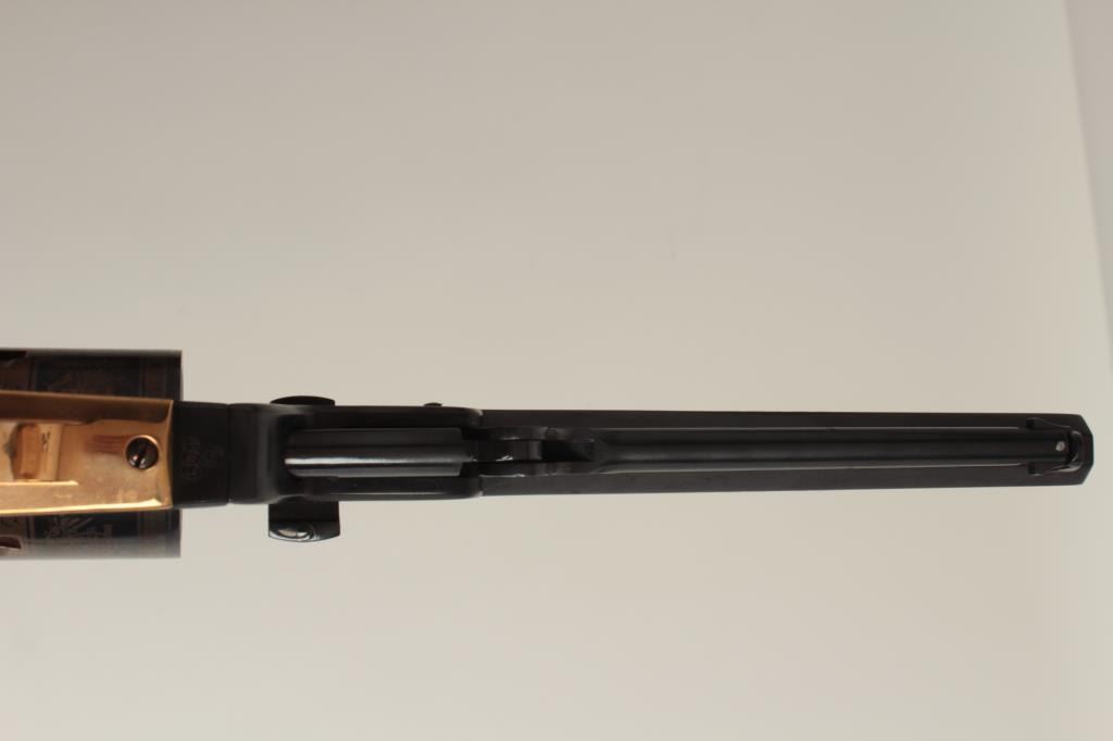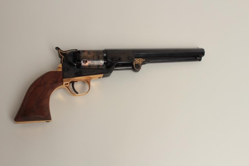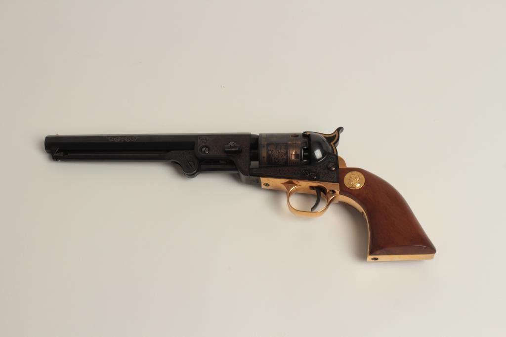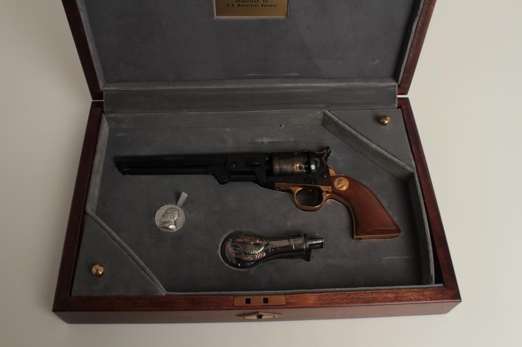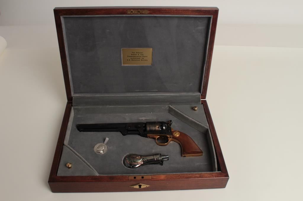 Official Robert E. Lee commemorative pistol authorized by U.S. Historical society, cased with medallion and accessories. .36 caliber reproduction of Navy size and style with decorative battle motifs in gold on bluebackground in French style case. Excellent with some storage and handling but no signs of firing. Est.: $700-$1400
