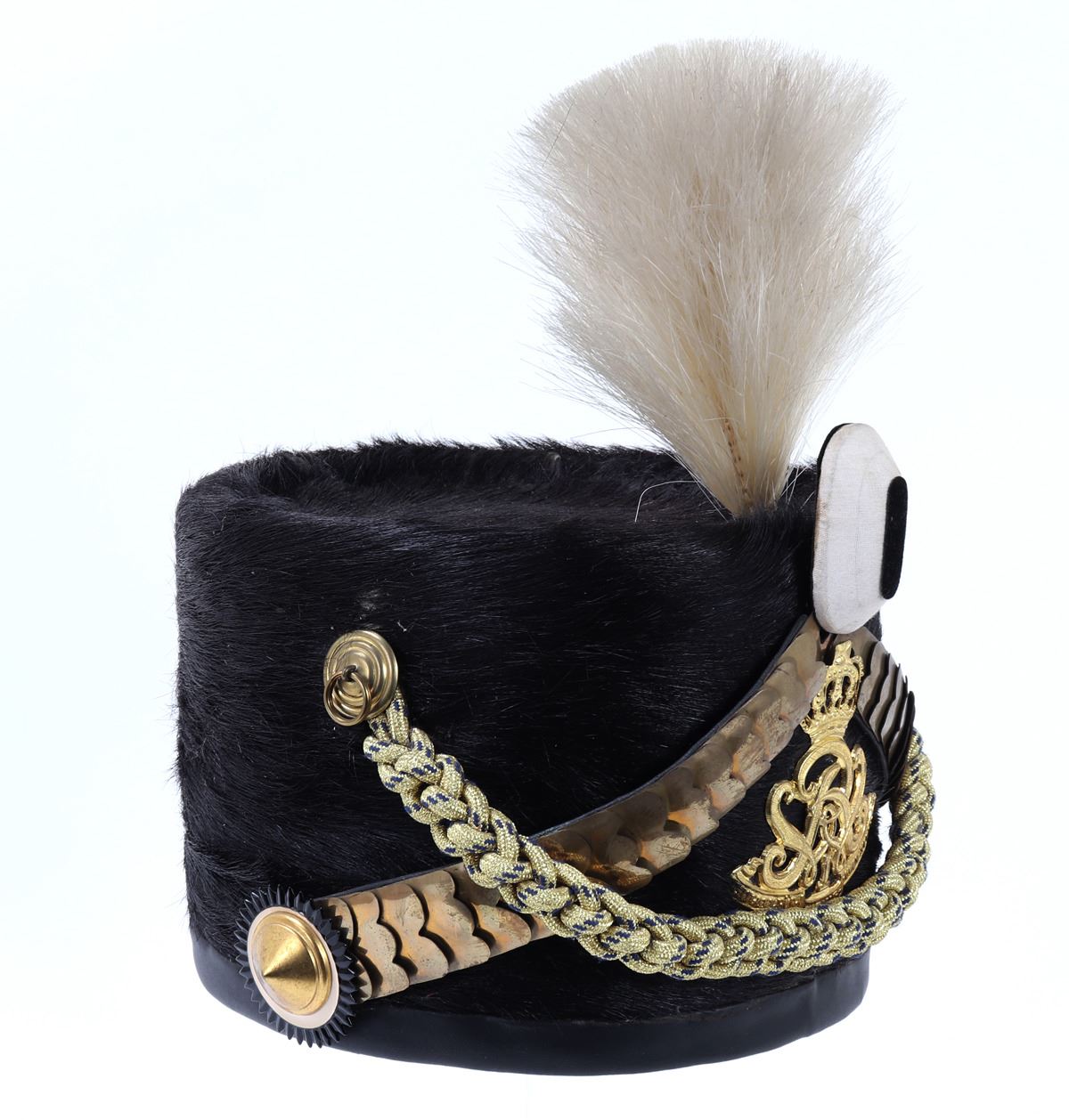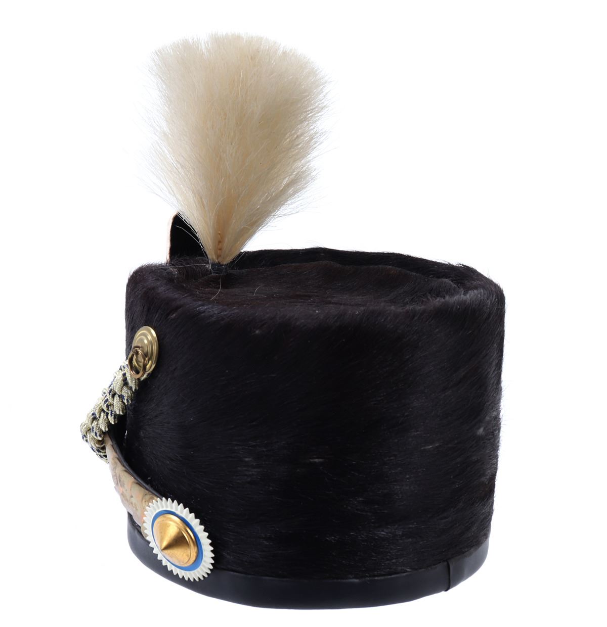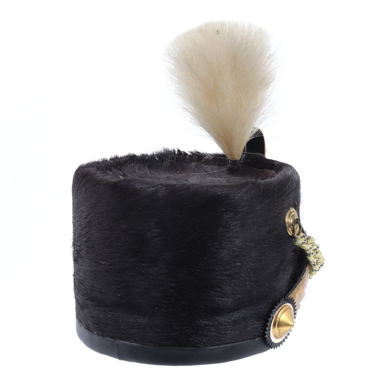 Old Prussian Hussar Regiment 7 Officers Privat style shako officers hat with busby badge. Reading to the underside of the cypher (Mit Gott Fur Koenig Und Vaterland). Size 8" W x 6" H, 11" H with Feather. Provenance: Southern California Militaria Collection