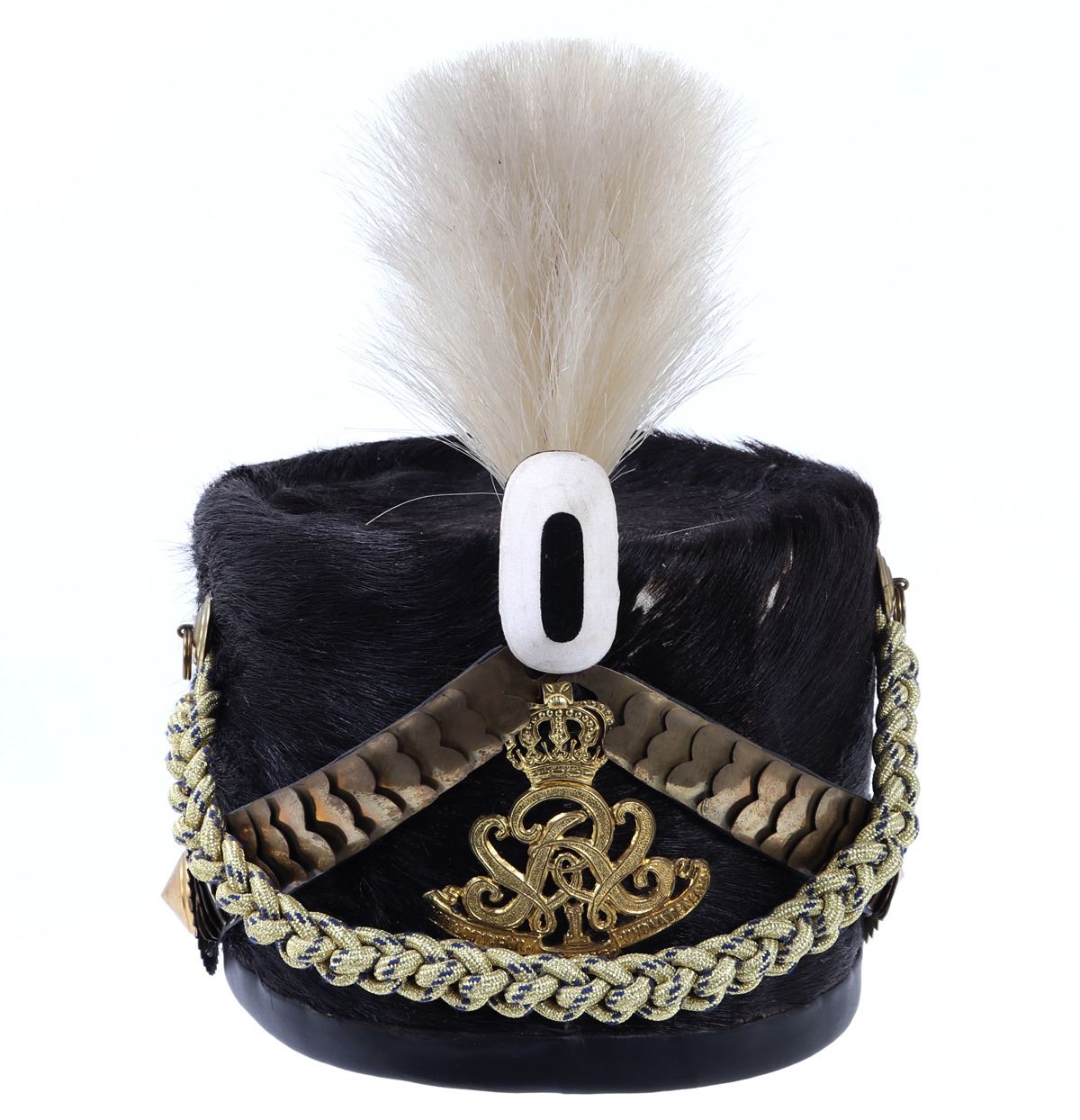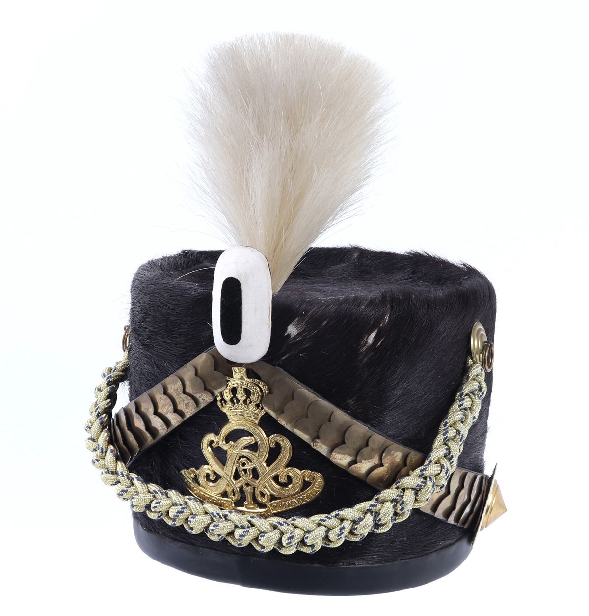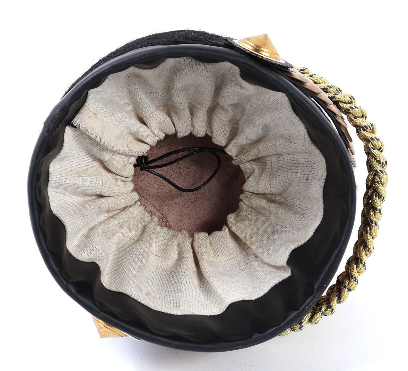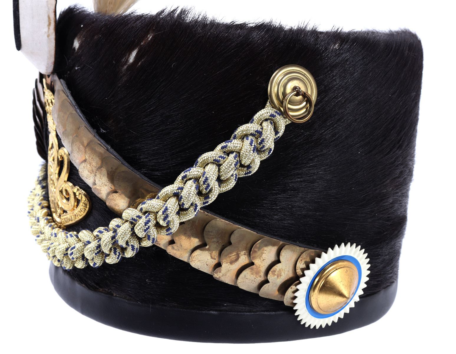 Old Prussian Hussar Regiment 7 Officers Privat style shako officers hat with busby badge. Reading to the underside of the cypher (Mit Gott Fur Koenig Und Vaterland). Size 8" W x 6" H, 11" H with Feather. Provenance: Southern California Militaria Collection