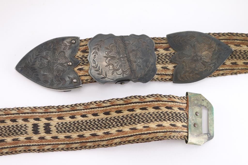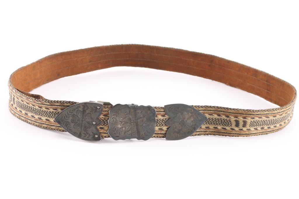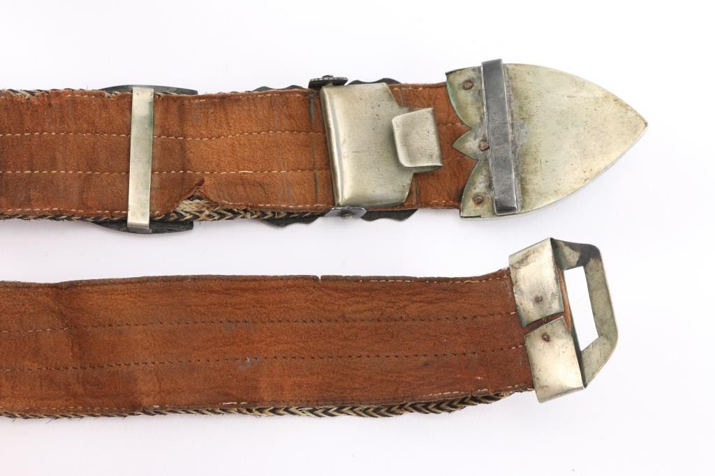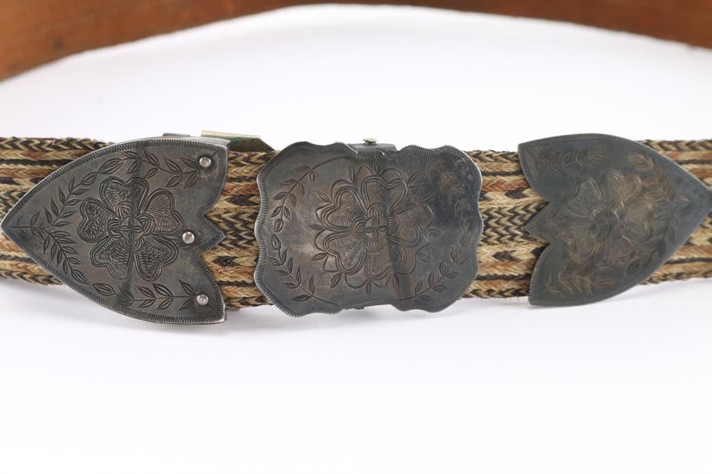 Measures 38". Old silver or silver tone has etched flowers and leaf garlands. Stitching on leather backing is undone at one end. In good condition for age.