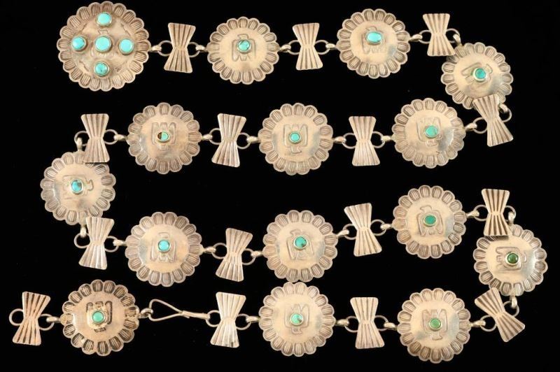 Link belt with fourteen round floral motif conchos, each with a center turquoise stone inside an etched eagle. In between each floral concho is a small silver butterfly. Buckle is a larger round with four inset turquoise cabs. Very petite and pretty.