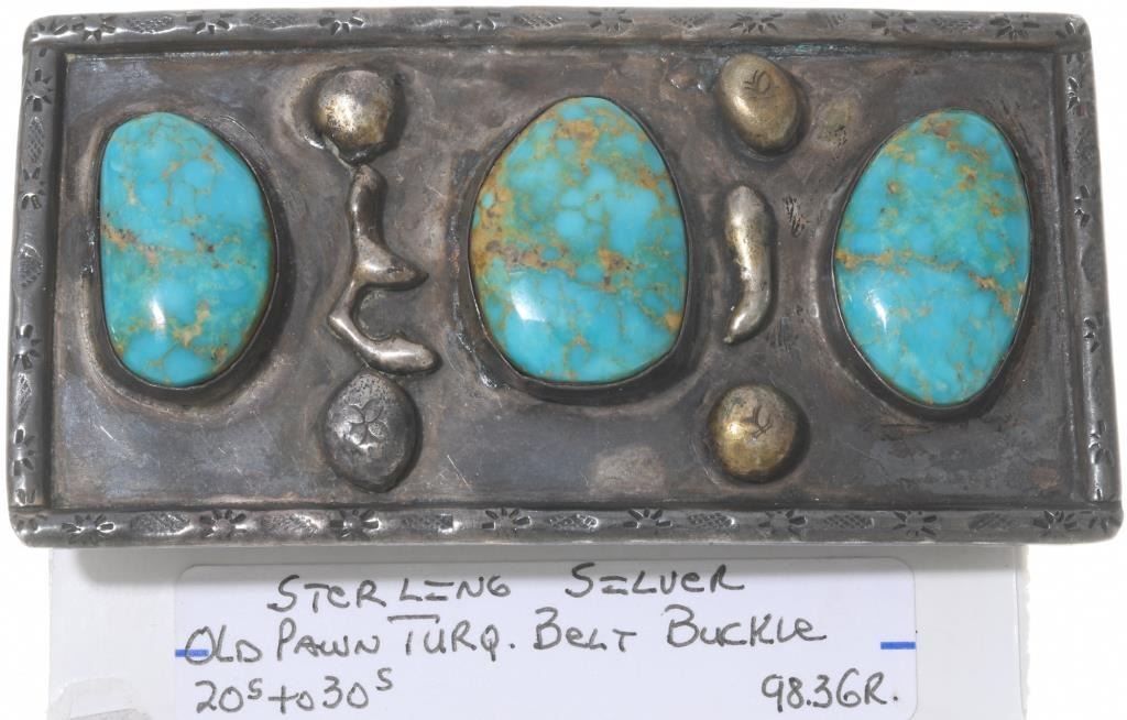 decorated with (3) turquoise stones from circa 1920 to 1930. In a rectangle shaped buckle. 92.7GR total weight.