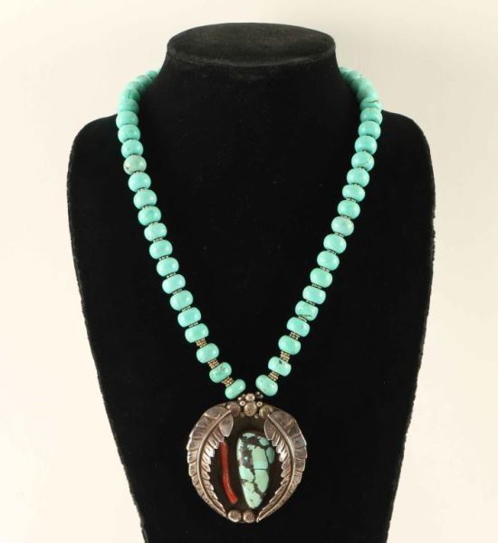 Light blue synthetic turquoise beads with small silver beads in between with a 2 5/8" l x 2 1/2"w sterling silver pendant with leaf motif encircling a triangular cab of turquoise with a nice matrix and a long thin piece of coral.