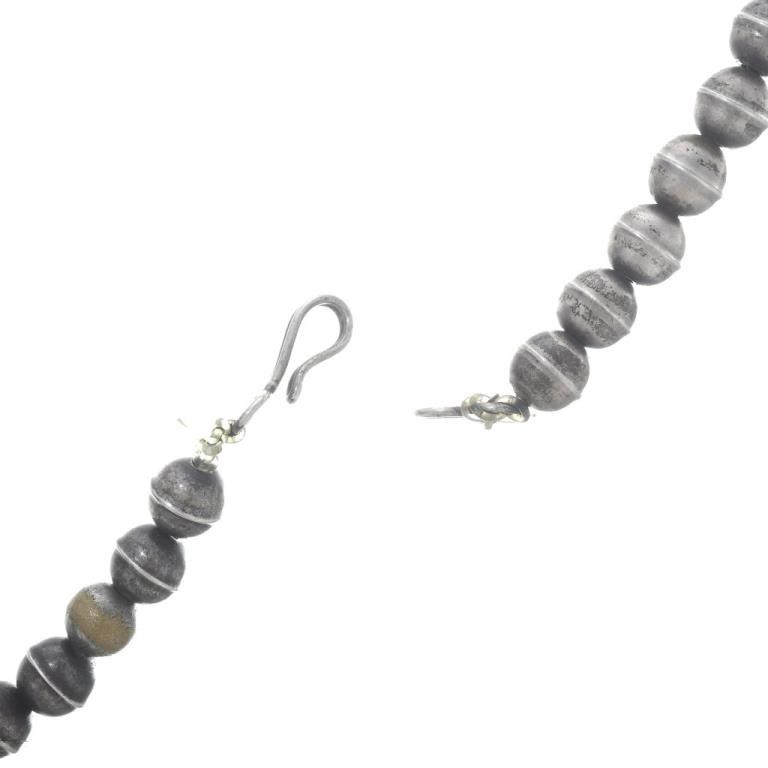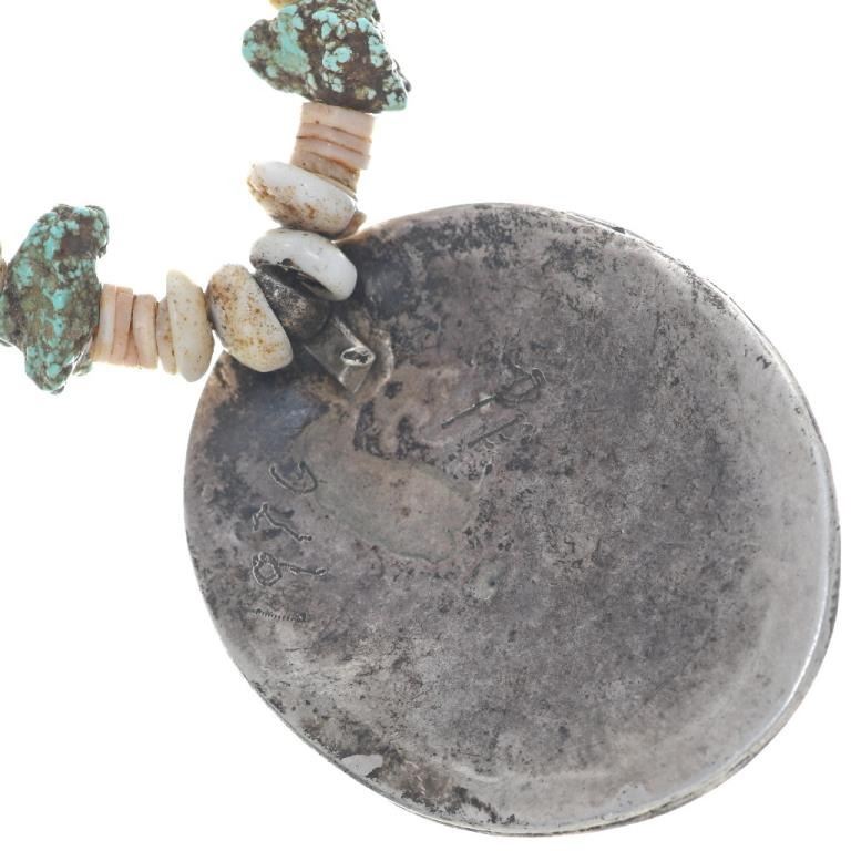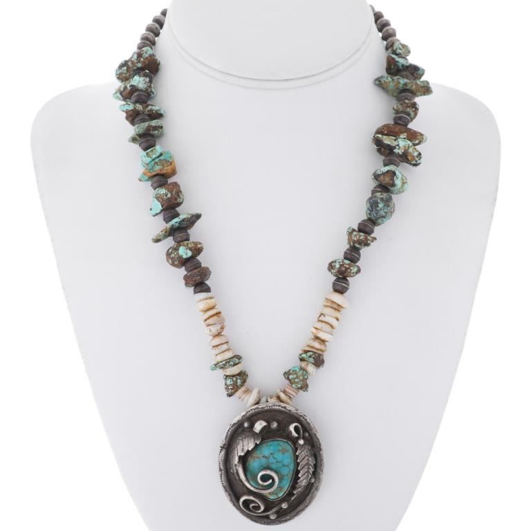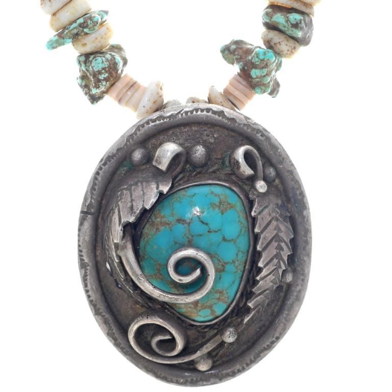 Handmade. This Old Pawn Turquoise Pendant Necklace is Navajo handmade jewelry for a man or woman. This Native design is set with Turquoise hugged by hand cut and hammered leaves, swirls and drops. It's 2" long and 1-5/8" wide and it comes with a 20" long, bone and Turquoise nugget necklace that's finished with Sterling bench beads. It's hand engraved with 1976 and signed PE.
