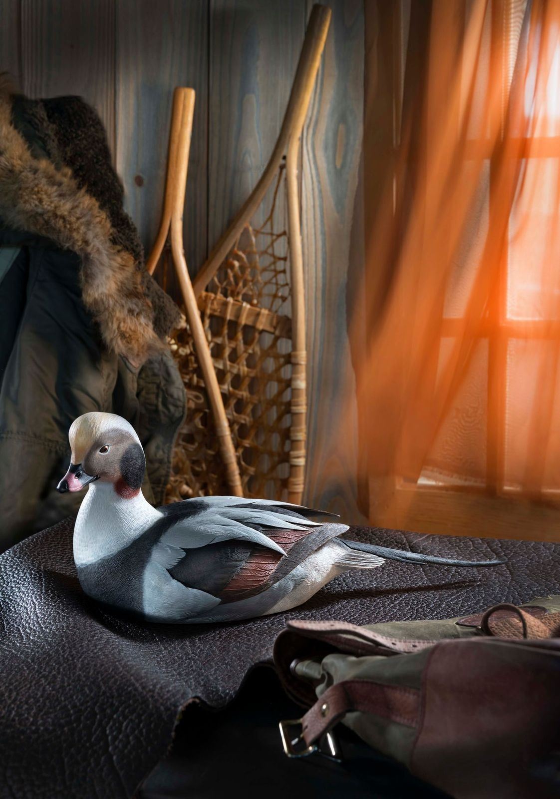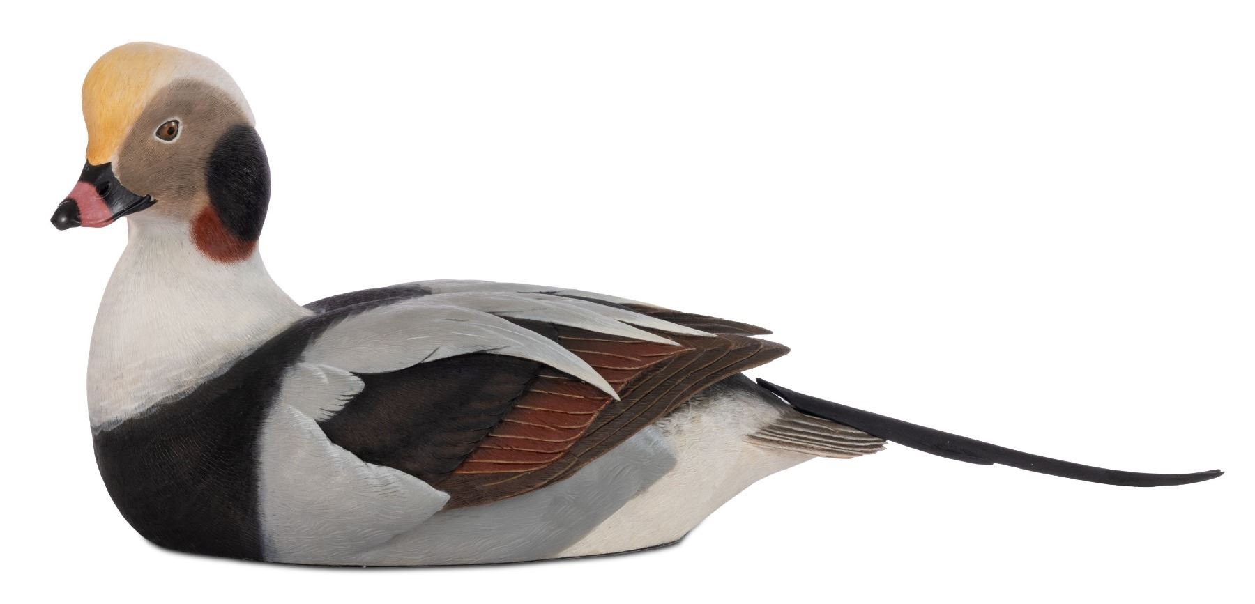 The Old Squaw Decoy of the Year stands as a remarkable testament to the artistry of Jude Brunet. This astonishing casting captures the essence of an Old Squaw with a level of realism and meticulous detail that is truly awe-inspiring. Jude Brunet's skill is evident in the intricate precision with which every aspect of the decoy is rendered. This marks Jude Brunet's second Decoy of the Year recognition, a testament to his dedication and mastery of his craft. His traditional approach, utilizing time-honored tools, adds an authentic and unique touch to his decorative decoys. Adding to its allure, a Ducks Unlimited cloisonné style medallion is inlaid in the felt-covered bottom, symbolizing the convergence of art, conservation, and appreciation for the natural world. This Old Squaw Decoy of the Year stands as a timeless embodiment of the art of decoy carving and the skillful craftsmanship that brings these avian sculptures to life.