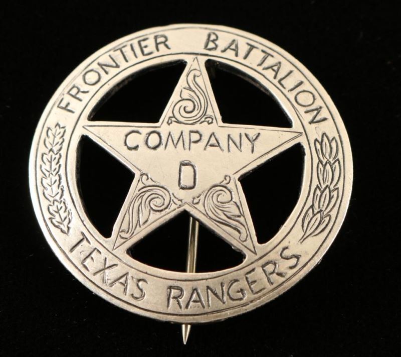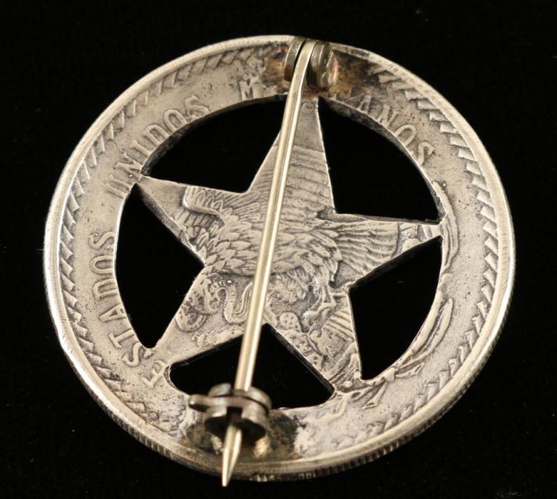 Battalion cowboy era law badge. Measures 1 19/16" in dia. The front reads 'Frontier Battalion Company D Texas Rangers'. Has a thin vertical pin back with a locking catch. This is a round silver Mexica Peso with a cut out star in the center.