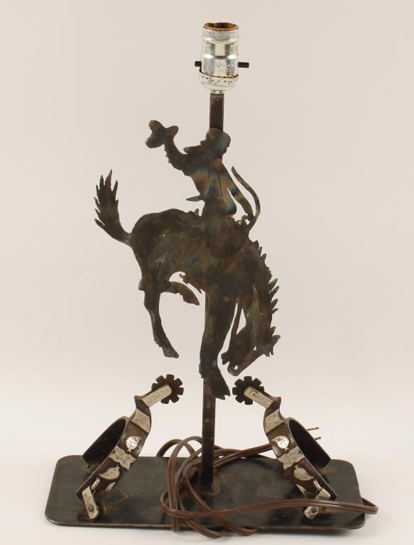 A pair of spurs with silver metal accents on the base which measures 12 1/2" wide by 5 1/4" long. The lamp itself stands 19 1/8" tall. Ride 'em Cowboy!