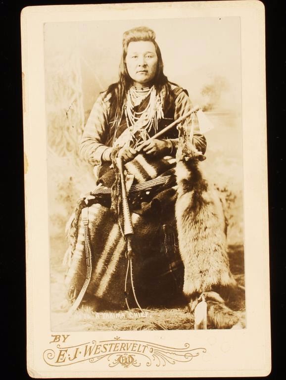 Measures 4 1/4" wide by 6 1/2" tall. The base of the cardboard card reads "Nolo A Yakima Chief". The photographer at the base of the card reads 'by E.J. Westervelt'. Offered "as is", we don't guarantee the authenticity of this item, please do your research. All sales are final.