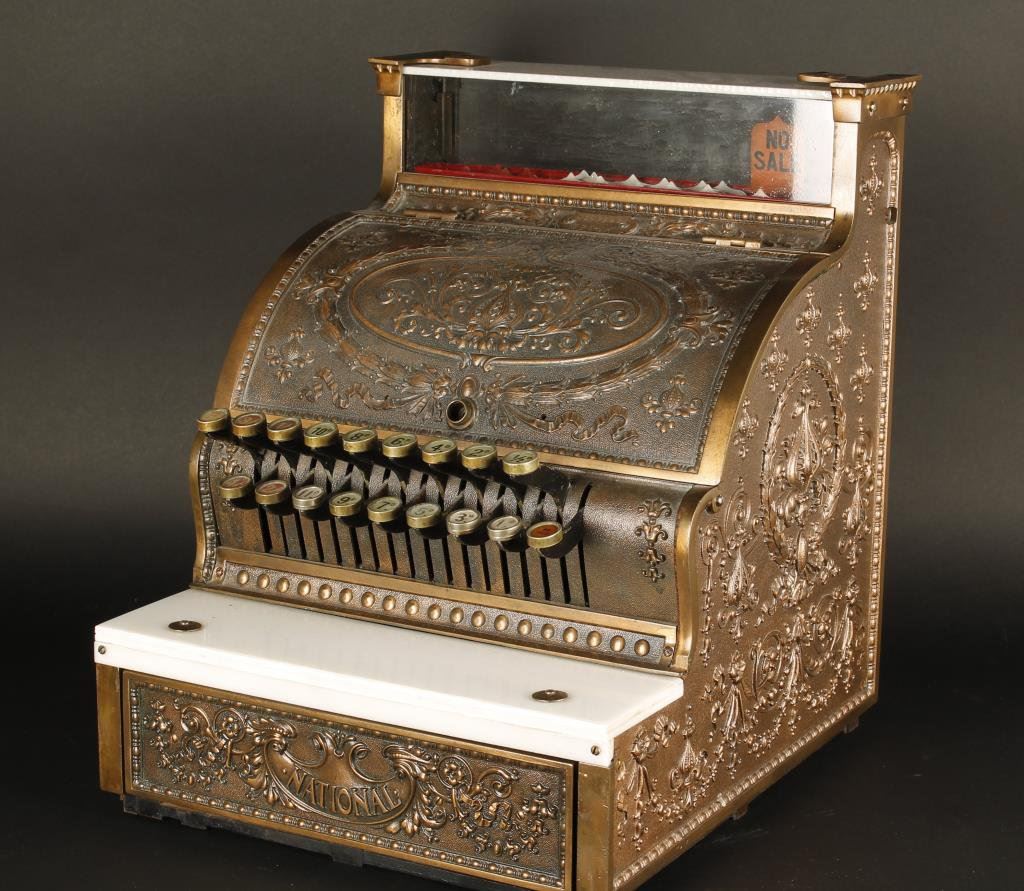 Old brass National Cash Register; approximately 17” x 13” x 15” overall and in good condition; keys are working at time of description; lock to open front missing. A great decorator for the home bar or man cave! Est.: $500-$1,000.