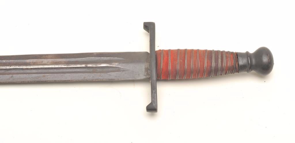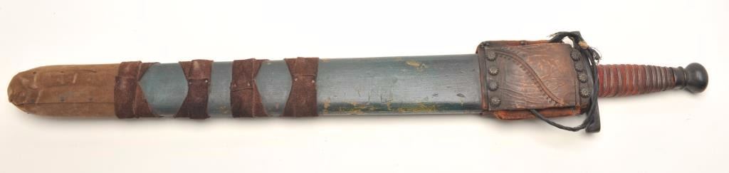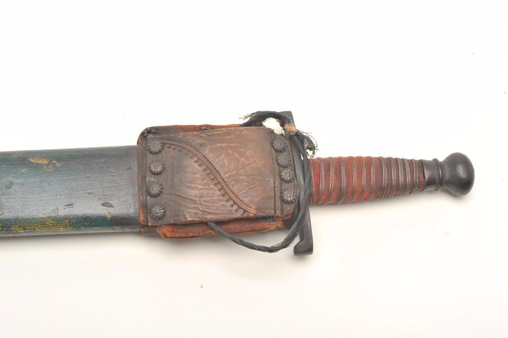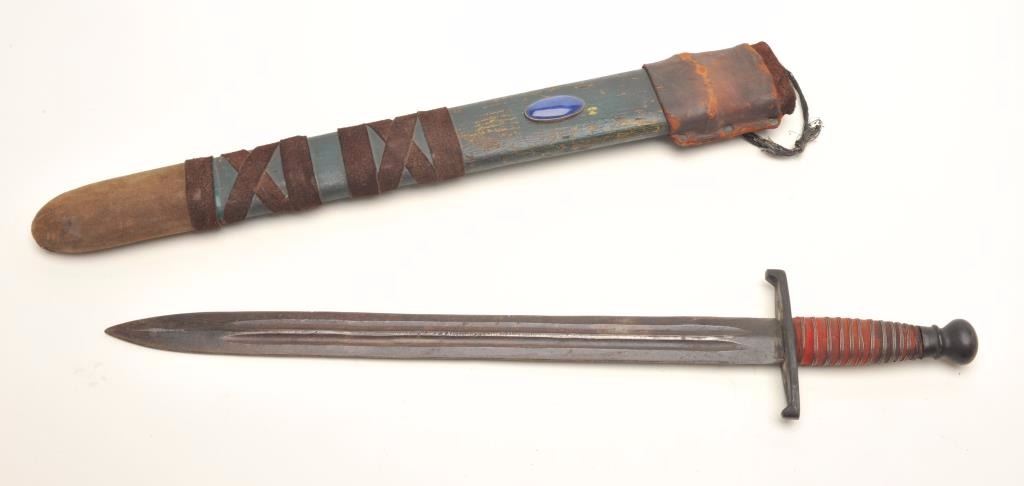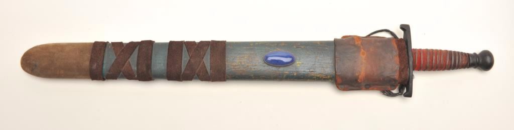 Older theatrical sword and scabbard, probably Golden Age of film ca. 1920’s to 1950’s; approximately 27” overall with a 22” blade. Est.: $150-$300.