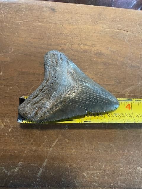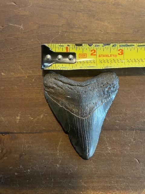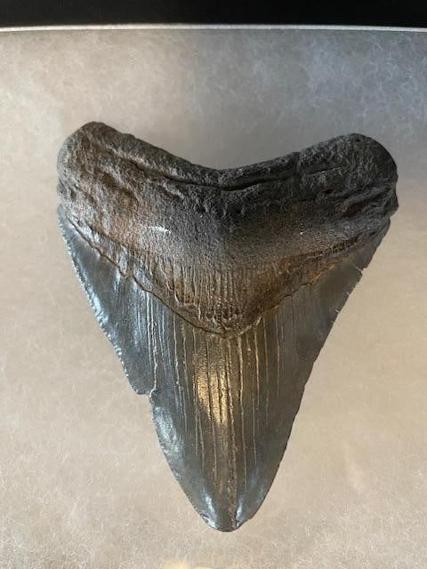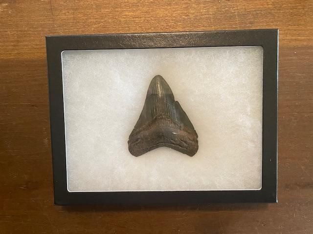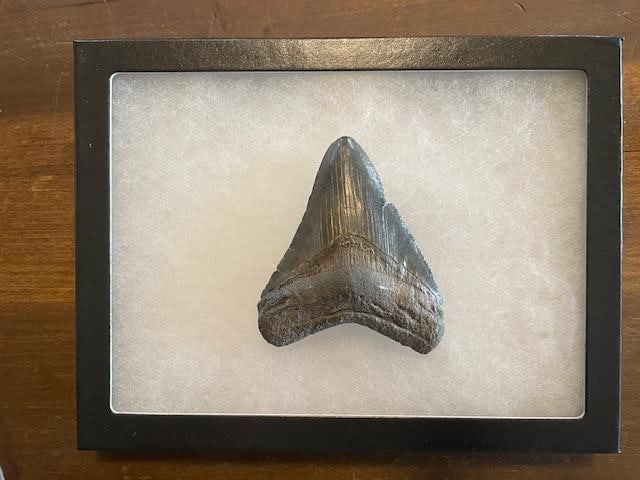 One Excellent and Monster Size MEGALODON SHARK Tooth Fossil. The Tooth measures 3.5" Long x 2.75" Wide. The Display Case measures 8.25" Long x 6.25" Wide. MEGALODON SHARK TEETH