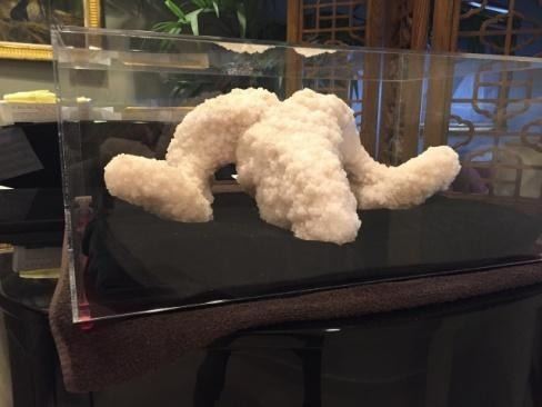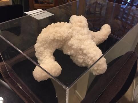 Halite is the mineralogical name for salt. These were originally purchased at the Annual Tucson Gem & Mineral Show from an Australian Opal miner, who, in turn, had acquired it from an Aboriginal in the Outback by trading a bottle of whiskey and some sort of firearm. The Aboriginal told the miner he had found this unique, mineralized relic on the shore of Lake Eyre, which is a huge lake-bed (usually dry) that floods every few years, then proceeds to dry out. Lake Eyre is the lowest point below sea level on the Australian Continent. When it does flood occasionally, its waters are exceedingly saline, and the ram’s skull was no doubt submerged for several months during the formation of the Halite crystals.