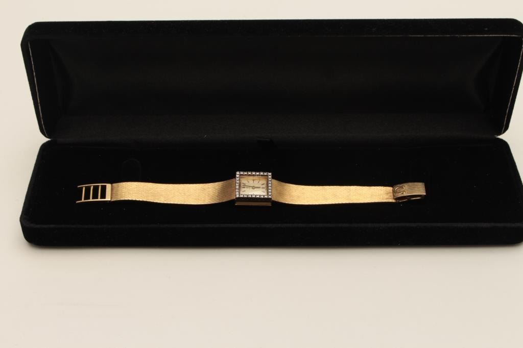 One vintage ladies omega wrist watch in 18k yellow gold and diamond bezel. (weight 43 gms). EST.$3,000-3,500