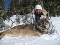 Hunts are conducted on over 1000 square miles of prime wolf habitat. The average weight is 100 pounds with mature males in the 125 pounds range. The majority of hunting is conducted by placing hunters surrounding sectors that have established active bait sites and then driving the wolves out to hunters on stand. This is a rifle only hunt with a minimum of a 243 caliber but 30 caliber preferred. Average shots are 125 yards at walking targets. Shot opportunity is 90% with proficiency @ off hand shooting being desirable.
