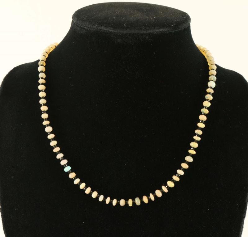 Displays the beautiful birthstone of October. An alternating pattern is achieved with the addition of 3mm, sparkling Spinel beads that contrast the gorgeous flecks of color in the 5mm Opal gems. About 19" long. It sparkles, it gleams!