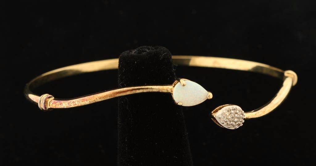 14K yellow gold wrap bracelet ends in an opal and a diamond set teardrop.