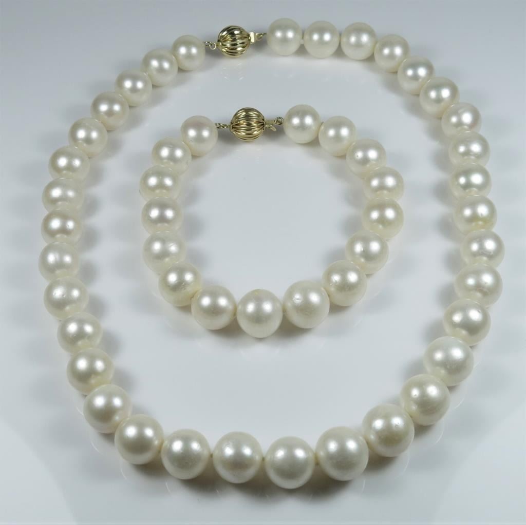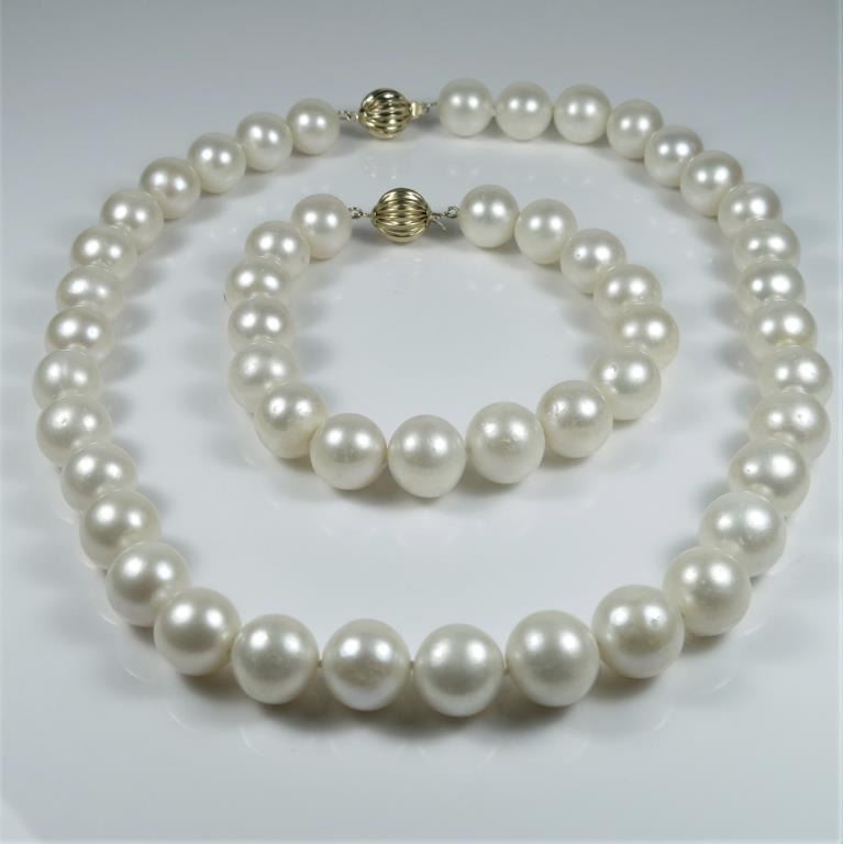 and Matching Pearl Bracelet featuring large 11-13 MM average diameter Pearls with rich color and luster both have matching 14 karat yellow gold round ball clasps. Retail $4,000-$6000