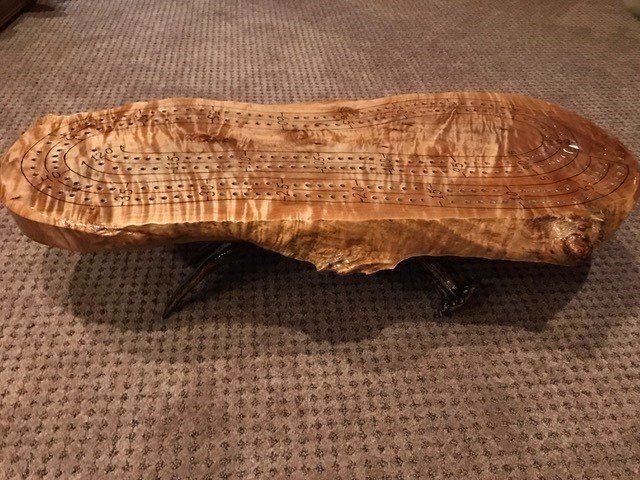 Renowned custom knife maker, Webb Hammond, offers this opportunity to acquire a one-of-a-kind, custom-made table top with cribbage board! This custom, table top crib board is approximately 3 feet by 2 feet and is made of three types of Maple: Fiddle, Birdseye and Quilted. The base that supports the table top is made of select Maple hardwood and moose antler. This beautiful item is truly a collector item perfect for your lodge, family room or game room! This item will be on display at the podium. Stop by for an up-close look at this beautiful table!
