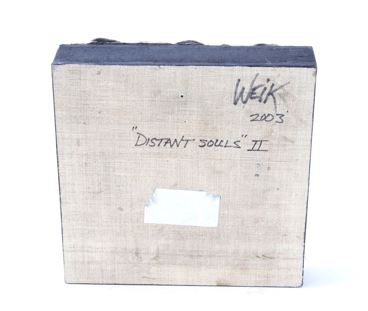 Roger Weik (b. 1949, American) Roger Weik is a contemporary abstract artist known for his richly textured, organic mixed-media paintings. Working primarily with copolymer emulsions and oxide pigments, Weik embraces spontaneity and chance, creating works that feel shaped by natural forces. He holds an MFA in Painting from Southern Illinois University and has exhibited nationally and internationally, including at the Musée d’Art Moderne in Lyon. His work is held in collections such as the Elgiz Museum in Istanbul and Chapman University’s Guggenheim Gallery. Weik currently lives and works in California. Size 10 1/4" L x 10" W. Condition: typical wear from age and use. Provenance: Collected prior to 2008, ex-Lacy Gallery (Vanna & Lee Lacy collection), Los Angeles CA. Lacy Gallery was founded upon six decades of collecting ethnographic and fine art. Lee Lacy was a distinguished Hollywood producer of iconic TV series and commercials.