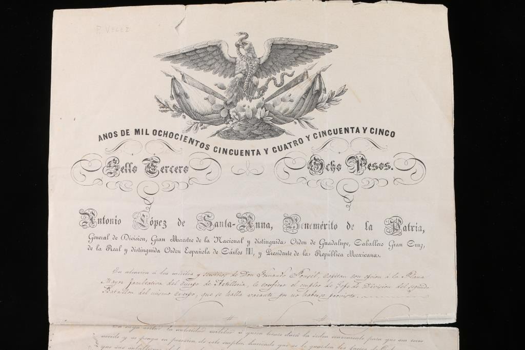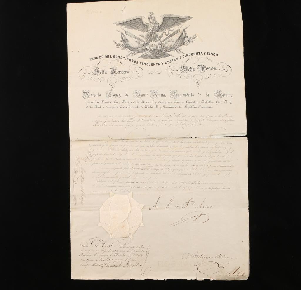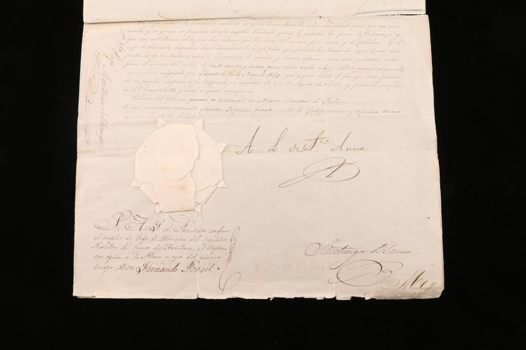 Signed and sealed with Mexican official seals. Our translator states this document concerns the awarding of a medal called "The Order of Guadalupe" and is signed twice with national sunburst seal attached. It was awarded to a gallant and meritorious captain. Considerably more significant than we realized! Note - Hand signed twice by General Santa Ana of "The Alamo" fame.