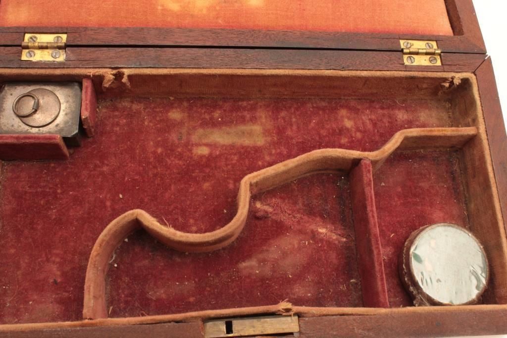 Original 19th century case for American revolver of percussion era, ca. 1850s-60s; smaller than ’49 Pocket Model with approximately 4” barrel and 8.5’ overall. Red velveteen lining; silvered oil containerof tin with percussion caps; walnut exterior; very good condition; possibly for a Bacon or IXL, etc. Est.: $350-$700.