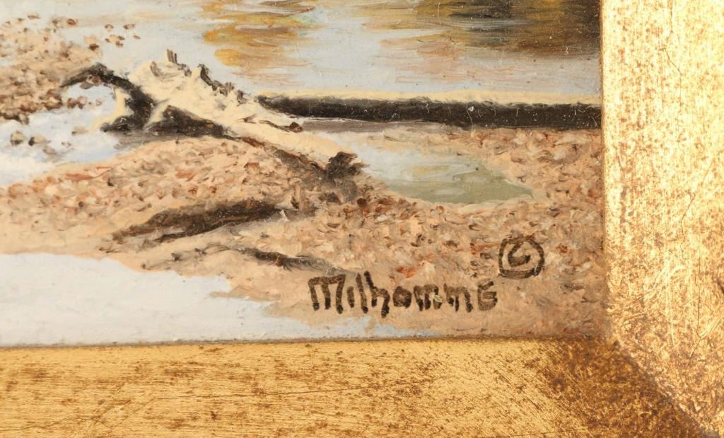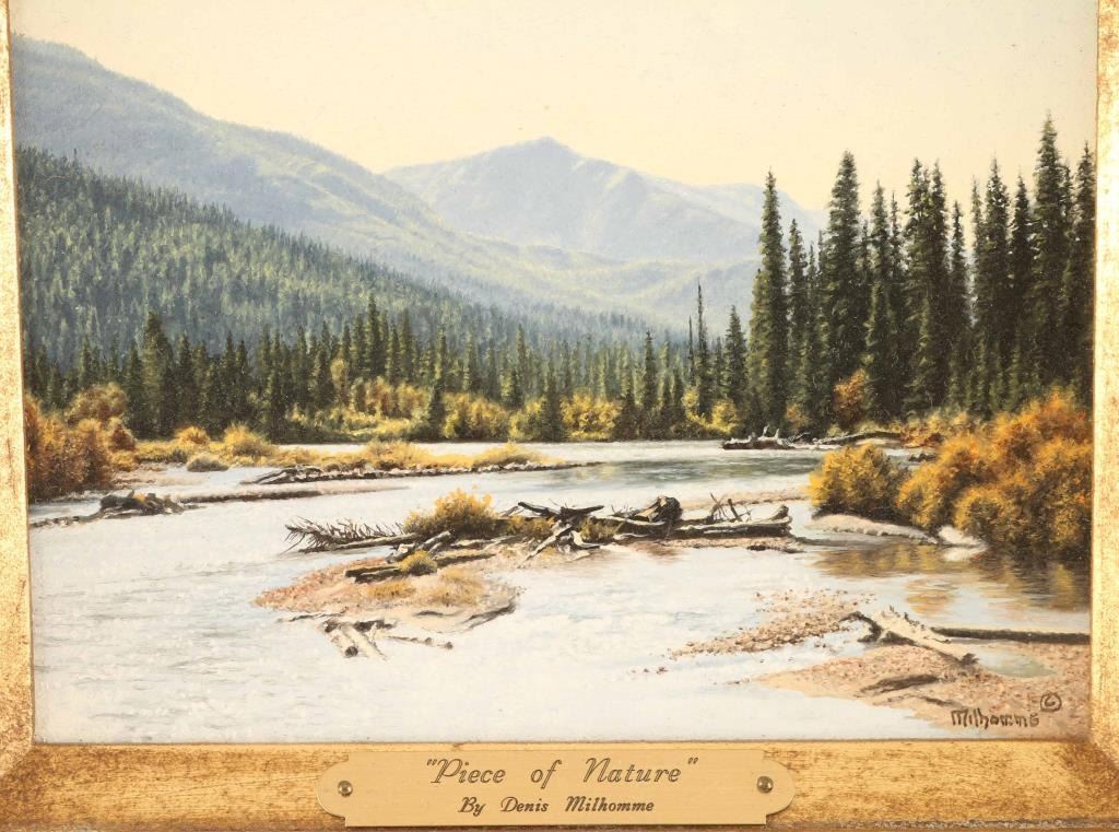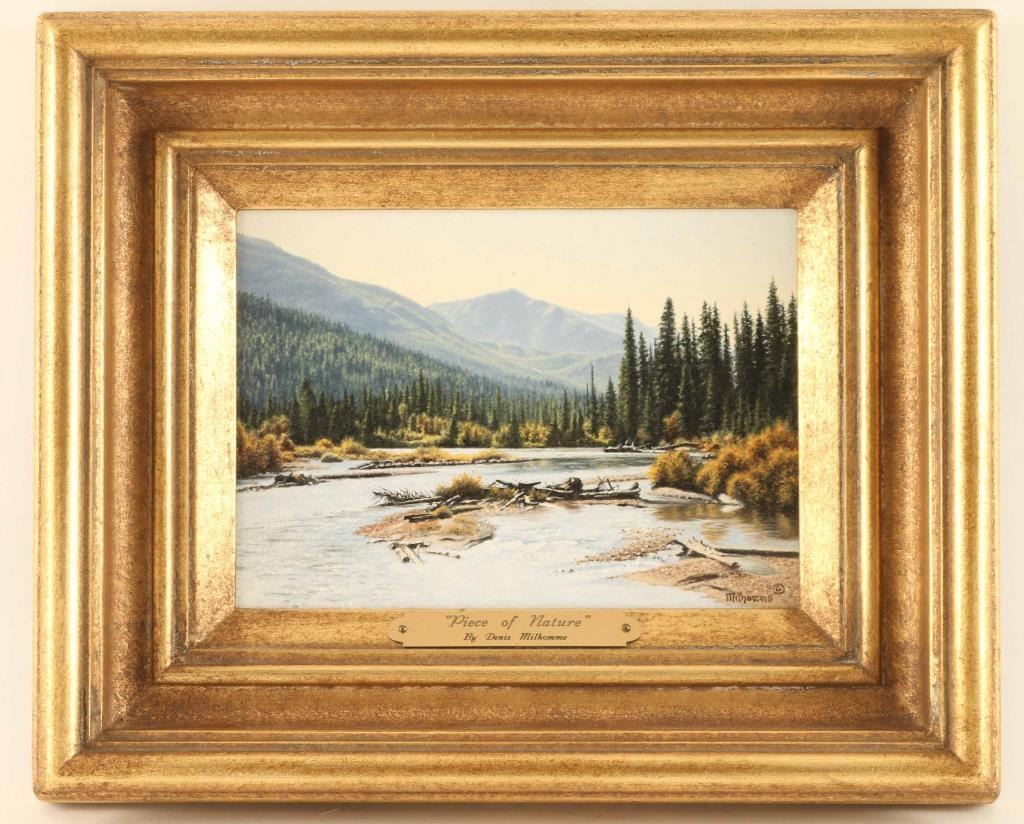by Denis Milhomme entitled Piece of nature, hand signed and measures 9"x7" . Bio-East of the Sun and West of the Moon. That phrase from a Princeton College song of the 1950's might aptly describe the life path of artist Denis Milhomme. Living a youth that encapsulated a typical rural New England childhood, young Denis epitomized the young kid full of energy and love of his surroundings. He early on displayed artistic leanings, though, and benefited from instruction as early as age 8. Progress in drawing covered exposure to pencil, pastel, watercolor and finally oils by the age of 15. Yet, Denis was still anchored in the usual teen activities and early jobs that kept him wed to the outdoor and nature. His early marriage was a misstep and in moving on with his life, Denis severed his Lowell, Massachusetts origins and headed West for California. A variety of jobs left him unfulfilled and he gradually drifted into art. That change was enhanced with professional workshops, study with well known artists such as Robert Abbett, and participation in art fairs that were then emerging as venues for new and relatively unknown artists. Just before age 30, Denis met his true Northstar and lifetime mate, Lorene, who injected the missing ingredient of confidence in his own worth as an artist. Lorene's prodding and encouragement coupled with her muse-like qualities, led to the moment of truth for Denis like so many artists, that being cutting the cord from wages to embark on a career as an easel painter. The formative years of observation, study, experimentation and innate sense of color and wonderment distilled quickly into an unmistakable style of realism that Denis refers to as "natural realism". In his hands, though, it is not photographical or photorealism, but a manifestation of his love of nature and compulsive dedication to the details of his subject matter. Denis and Lorene created the perfect house and studio location with their move to the edge of Sequoia National Park in the verdant surroundings of trees, rivers, and mountains, yet so close to the desert whose subject matter continues to extract new sensations and visceral interpretations of what he sees before him. Milhomme's career is now firmly established with important awards such as Arts for the Parks Region II Winner-1993, Arts for the Parks "Best in Landscapes-2006', Arts for the Parks Franklin Mint Award, Best of Show @ Phippen Western Art Show-1993, First Place in Oils at Southwest Art Festival, and many others now on his resume. He is especially proud of his participation in the American Masters show at the Autry National Center, the Quest for the West show and sale at the Eiteljorg Museum of Native American and Western Art, and several miniature shows such as Small Wonders-Great Works at the Cowboy Hall and the Settlers West Gallery Miniature show. Denis Milhomme's paintings are now adorning the walls of many important collectors. Some question his concentration on smaller canvasses, but his labor intensive approach inherently limits production. Naturally, his gallery representation suffers from lack of production and inventory because his works sell almost immediately upon hanging. Nevertheless, Milhomme is content to produce 35-40 works each year which he can proudly offer his followers, knowing that few will go unsold.