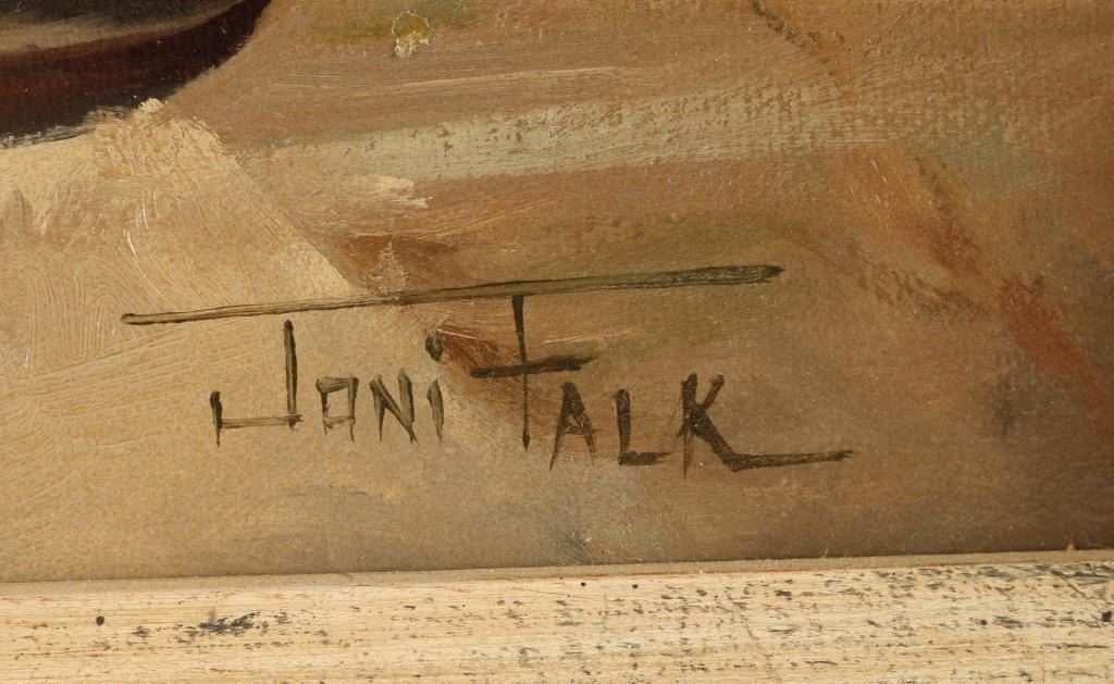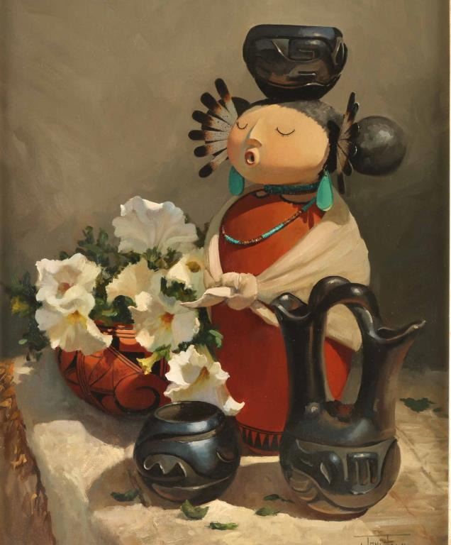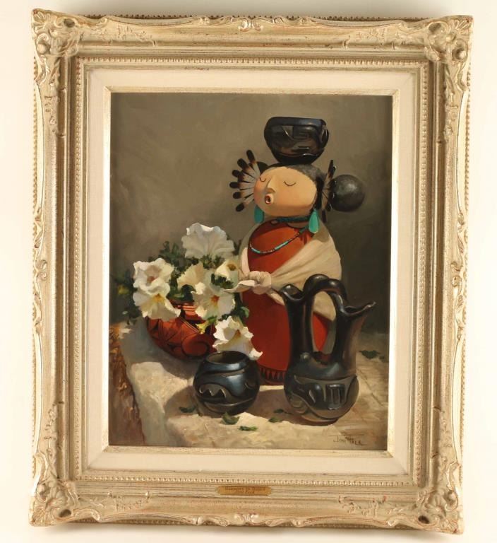 by noted realist artist Joni Falk depicts a pottery and kachina stillife hand signed lower right hand corner. Measures 15.5"X19.5" . Entitled Harmony in Design. Bio-Joni Falk realist painter of still life and landscapes, has lived in Phoenix, Arizona since 1960. She grew up in Chicago, and graduated from Marquette University in Milwaukee, Wisconsin. It was the Southwest culture and history that compelled her to seek a full-time career in the field of art. She has become known for traditional floral still lifes, western still lifes, Pueblo or Plains Indian landscapes and Indian figures. Falk's exhibitions include The National Museum of Wildlife Art in Jackson, Wyoming; the Albuquerque Museum, Albuquerque, New Mexico; Cheyenne's Old West Museum; The Tucson Museum of Art, Tucson, Arizona; and the Desert Caballeros Museum in Wickenburg, Arizona; the McAllen Museum, McAllen, Texas; and the Phippen Museum, Prescott, Arizona.