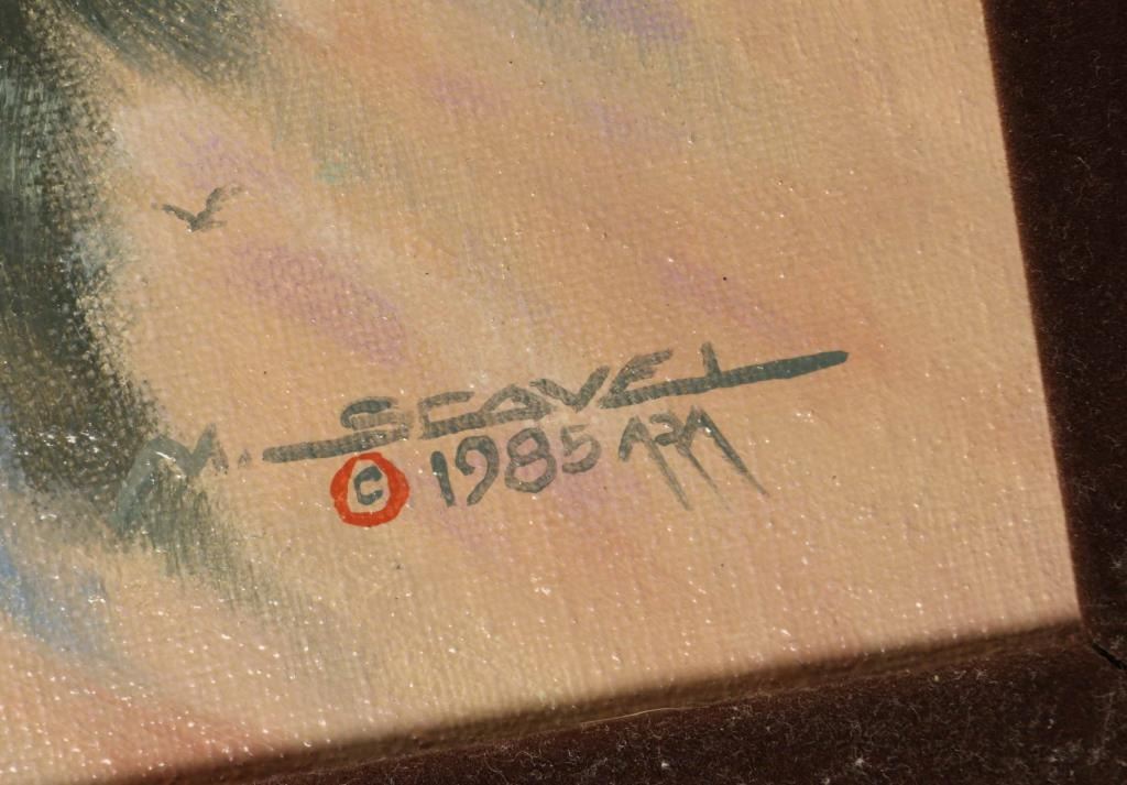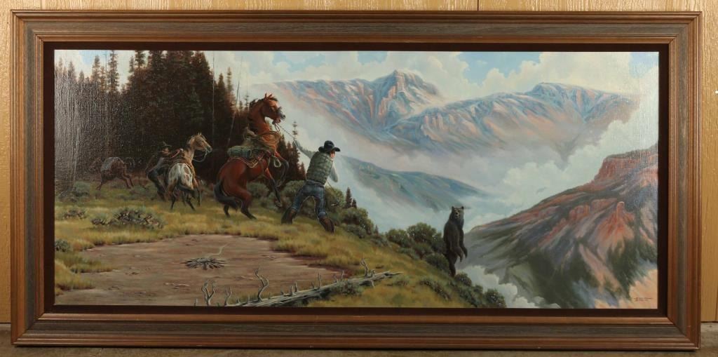 by M. Scovel. Signed in the lower right hand corner and dated 1985. Entitled "When Cowboys Meet the Bear". Measures 55" x 23" in wood frame.