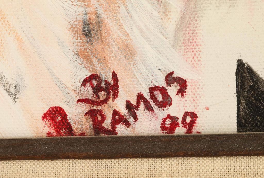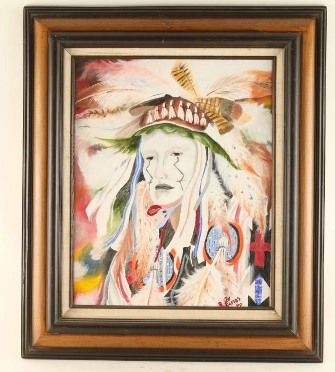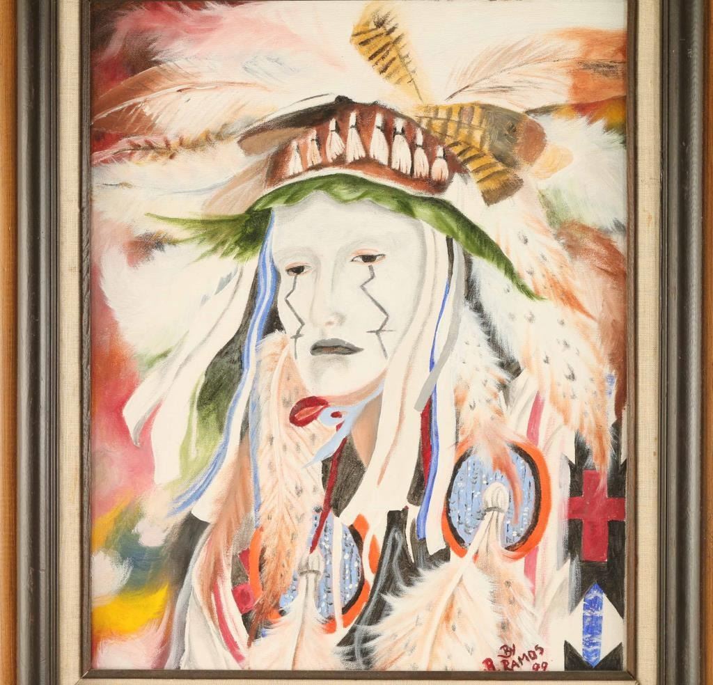 signed in the lower right hand corner "B. Ramos" this piece is a portrait of a Native American wearing a heavily decorated headdress and white face paint with black zigzag lines coming from their eyes. Framed, image size 15 1/2" x 19 1/2".