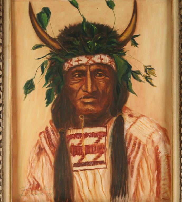 depicting a portrait of an Indian chief with a headdress, signed in the lower left hand corner and comes with a frame. Image size is 22" x 28".