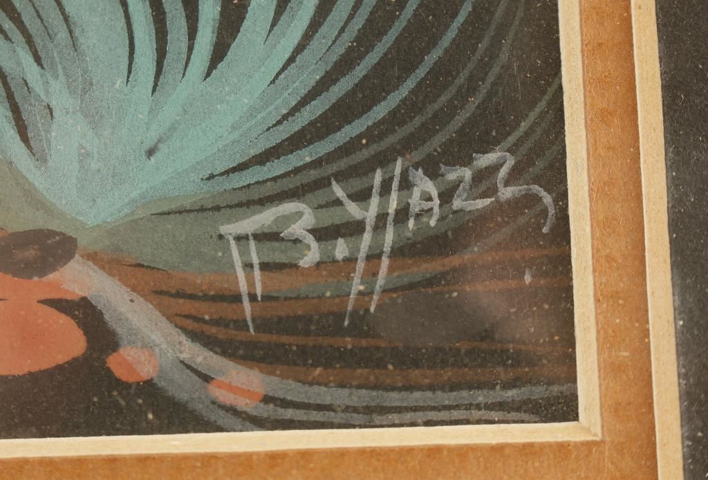 Depicts Ceremonial Dancer, double mat and frame. Image measures 9 1/4"x9 1/4". From AskArt.com- "Several books are based on his life and career, and he has been featured in numerous publications. He has won awards at every major showing of Indian art throughout the United States. The artist was drawing and writing with crayons at eight years of age. Sallie and Bill Lippencot, operators of Wide Ruins Trading Post, influenced him most by recognizing and encouraging his talents. While still a student, he sometimes worked in oils from a model. Today Beatien prefers to paint animals and people, not landscapes, in the casein medium. (Jeanne Snodgrass, "American Indian Painters). Beatien Yazz stated that he had been "painting since age eight," a long career in art that spanned over a fifty-year period. "I established myself nationally and internationally. In addition to my three oldest sons, Irving, Marvin, and Calvin (QQ.V.), I have three other children entering the field of art; my daughter, Francis Toddiy (Q.V.), who has been painting since she was ten, Jimmiy, Jr., and Orland Toddy. They are eleven through twenty-two years of age." (Artist,Personal Correspondance 1991). In recent years the artist's eyesight has deteriorated, and he has only peripheral vision. According to his long-time friend, Sallie Lippencott Wagner, he has glaucoma, and it has progressed too far to be treatable. He continues to paint, but only in a limited way."