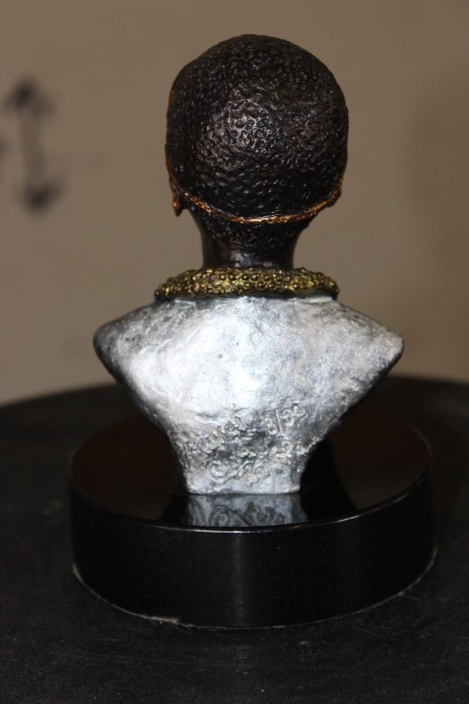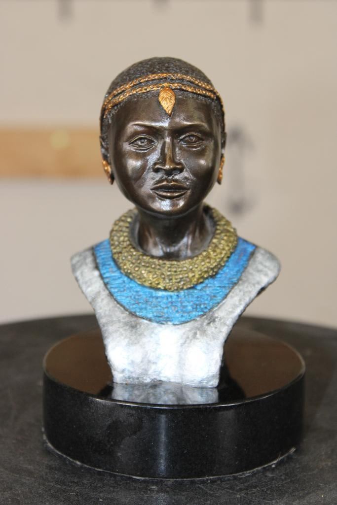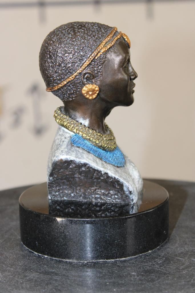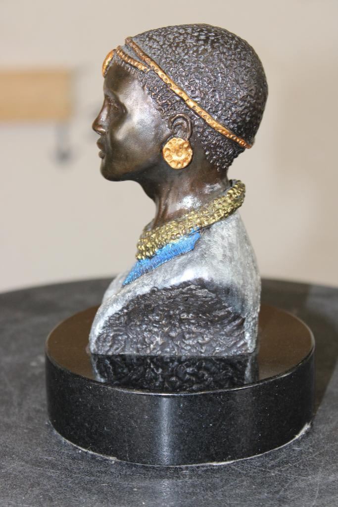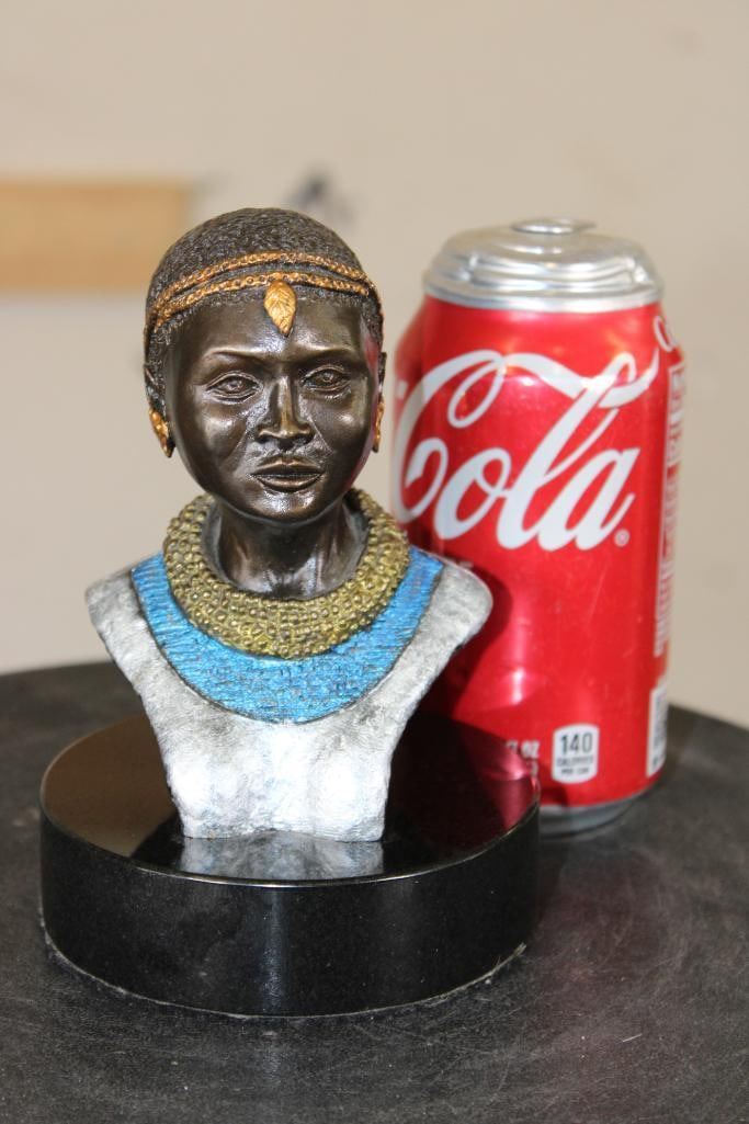 Original Bronze Female Masai Woman Bust on a Black Granite Base. It has been signed "Raj S. Paul 04' " and is numbered #8/50. It has been enhanced with bright hand-painted details. The Sculpture measures 6.25" Tall x 4 1/8" Wide. The Total Weight is 3 lbs 11 oz. COLLECTIBLE AFRICAN ART BRONZES