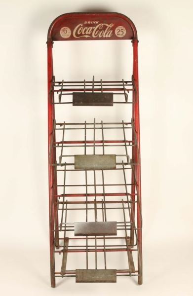 Red painted four shelf rack that is all metal with painted Coca Cola logo reads "6 bottles not iced, carton 25 cents plus deposit".