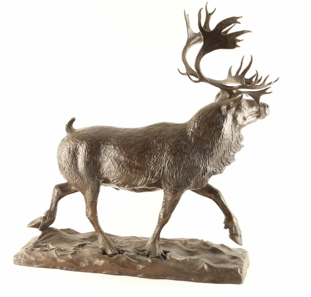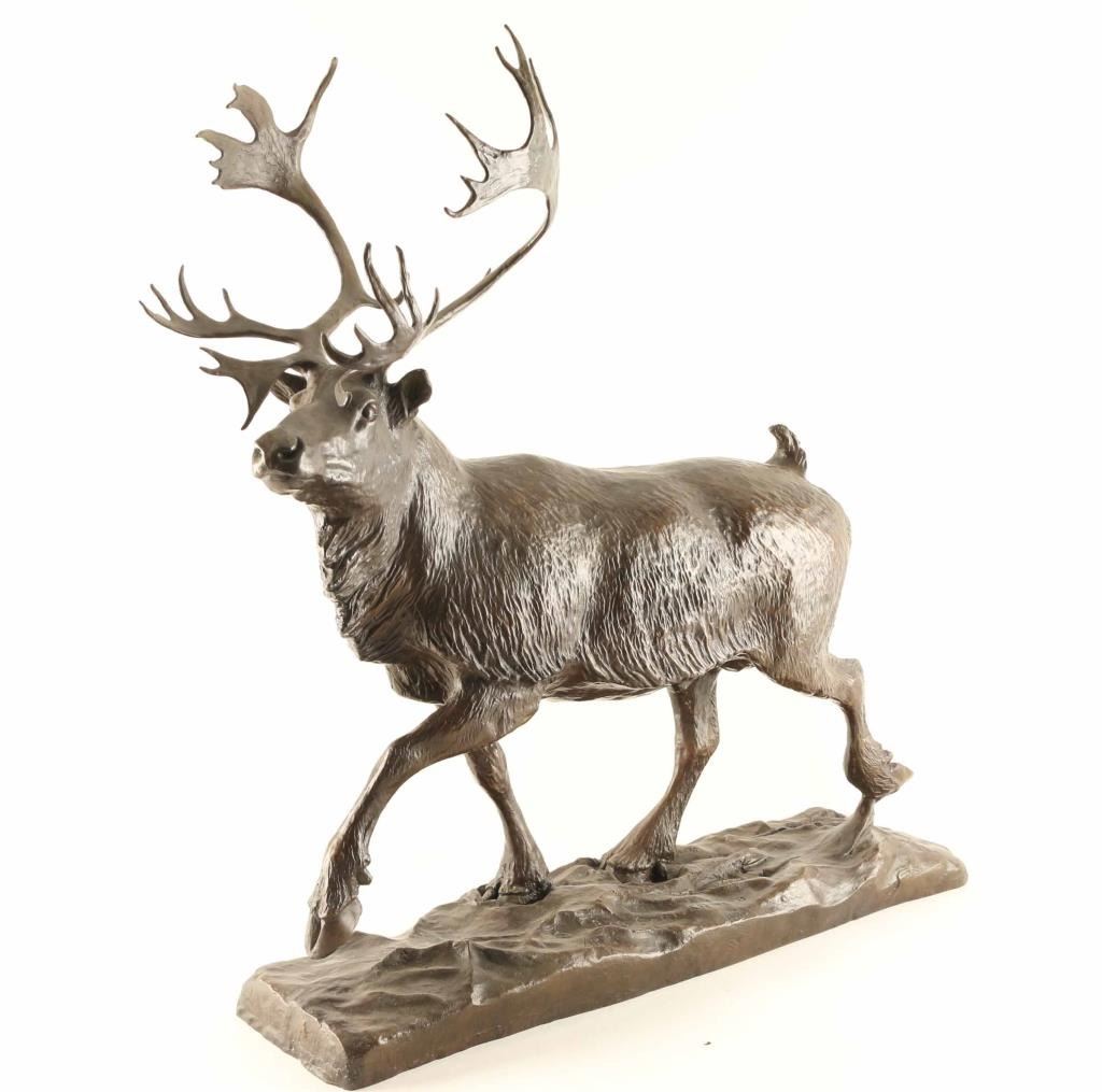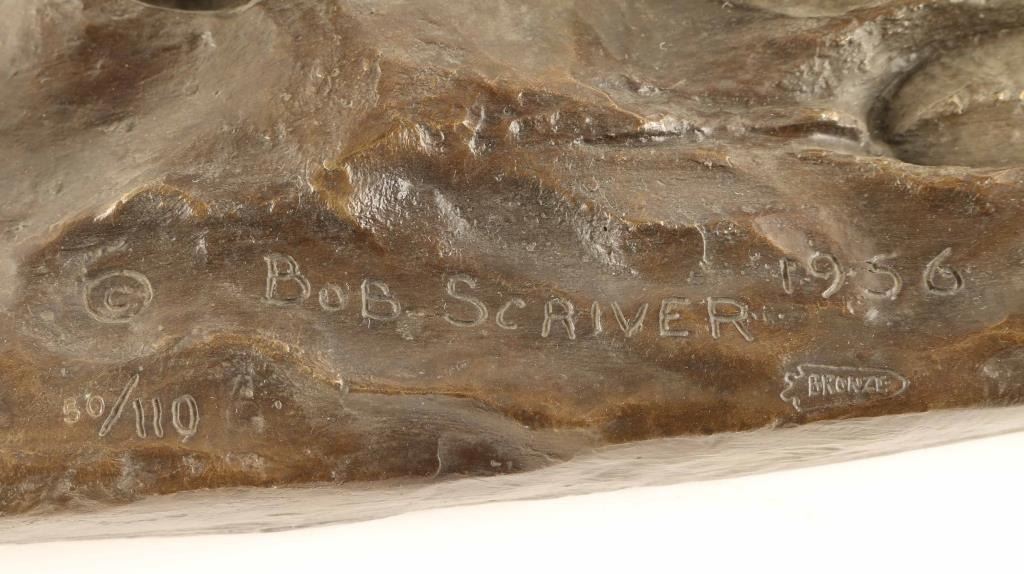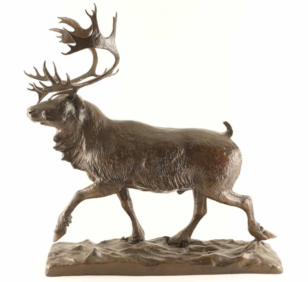 entitled "Caribou". #50/100, measures 25" x 21" x 6". Signed on base. Bio- Born: 1914 - Blackfoot Reservation, Montana Died: 1999 - Browning, Montana Known for: Animal and western sculpture Name variants: Robert Macfie Scriver A sculptor who carried on the realistic, storytelling tradition of Frederic Remington and Charles Russell, Bob Scriver was born on the Blackfoot reservation in Montana. Many of his life-long companions were from that tribe, and many of his works captured the frenzied action of cowboys and Indians and the animals they either rode or chased. His education began in Browning, Montana and he ultimately earned a Master's Degree in Music and then taught public school in Browning and Malta. He also played in professional bands across the Northwest and Canada before turning to taxidermy in 1951. He used those skills in his job of developing the Museum of Montana Wildlife in Browning. He also created a large sculpture of Charles Russell, hoping it would be accepted for the Statuary Hall in Washington. Although it was rejected, his sculpting career took off, and he received much recognition including membership in the Cowboy Artists of America and the National Academy of Western Art. He did several series of sculptures including 33 works of the Rodeo and 53 pieces tracing the history of the Blackfoot Indians. He was a collector of so much cowboy and Indian memorabilia that after his death on January 29, 1999, several auctions of these items were held.