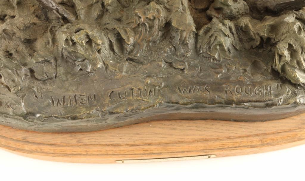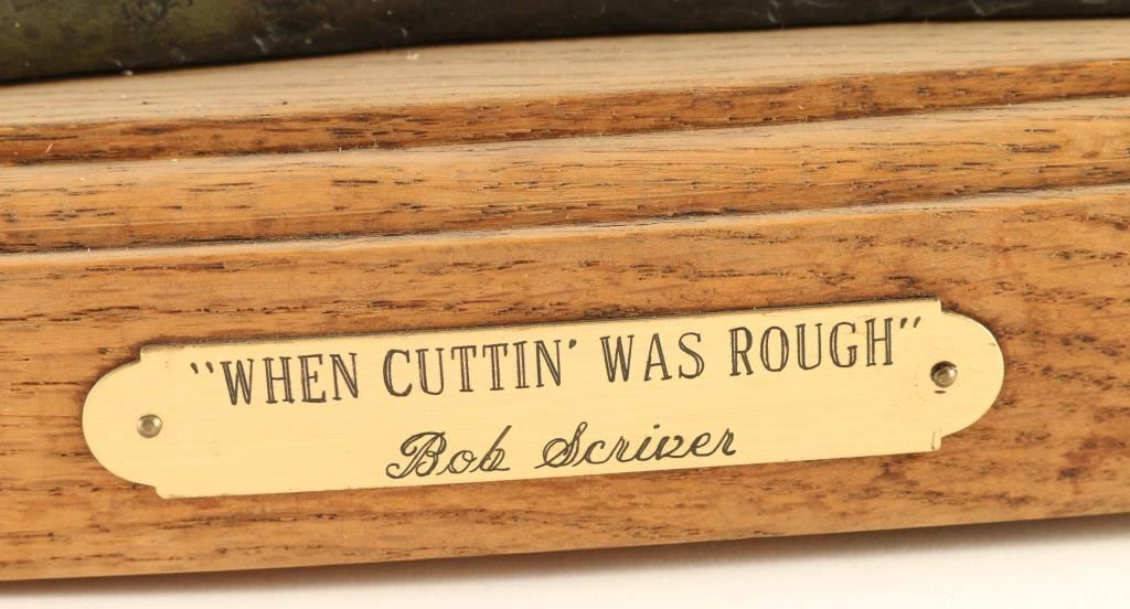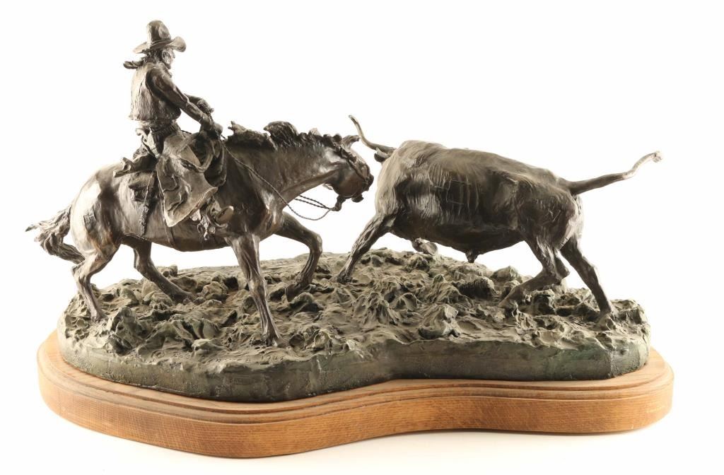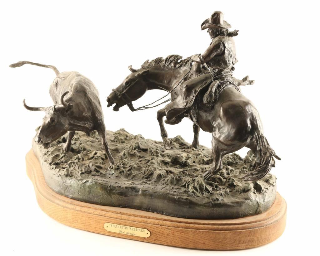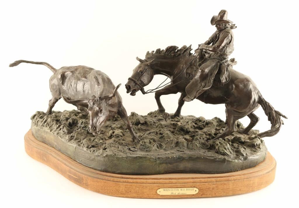 entitled "When Cuttin' was Rough", #30/110, signed on base. Measures 28" x 14" x 16". Born: 1914 - Blackfoot Reservation, Montana Died: 1999 - Browning, Montana Known for: Animal and western sculpture BIO- A sculptor who carried on the realistic, storytelling tradition of Frederic Remington and Charles Russell, Bob Scriver was born on the Blackfoot reservation in Montana. Many of his life-long companions were from that tribe, and many of his works captured the frenzied action of cowboys and Indians and the animals they either rode or chased. His education began in Browning, Montana and he ultimately earned a Master's Degree in Music and then taught public school in Browning and Malta. He also played in professional bands across the Northwest and Canada before turning to taxidermy in 1951. He used those skills in his job of developing the Museum of Montana Wildlife in Browning. He also created a large sculpture of Charles Russell, hoping it would be accepted for the Statuary Hall in Washington. Although it was rejected, his sculpting career took off, and he received much recognition including membership in the Cowboy Artists of America and the National Academy of Western Art. He did several series of sculptures including 33 works of the Rodeo and 53 pieces tracing the history of the Blackfeet Indians. He was a collector of so much cowboy and Indian memorabilia that after his death on January 29, 1999, several auctions of these items were held.