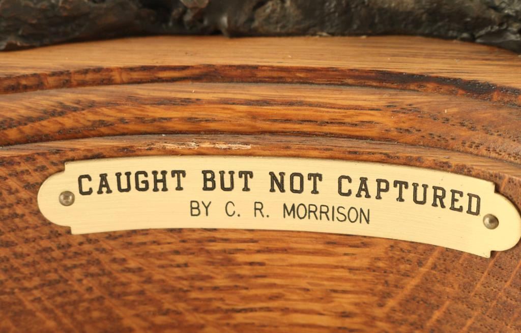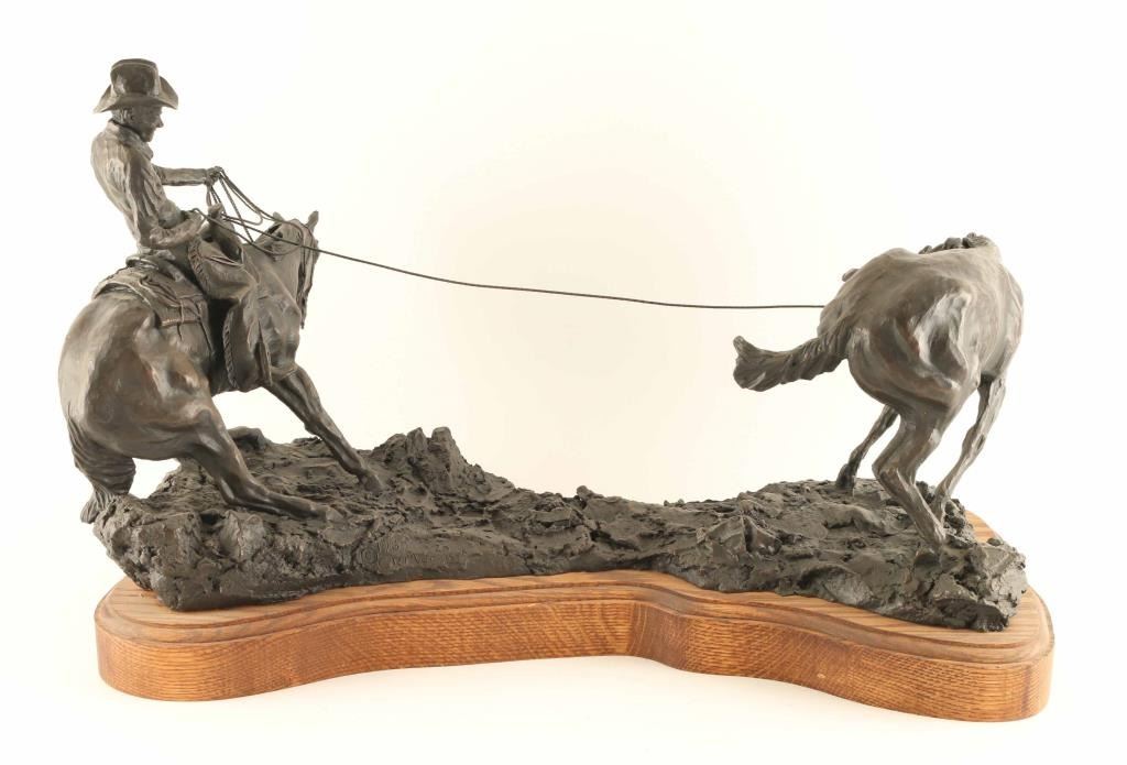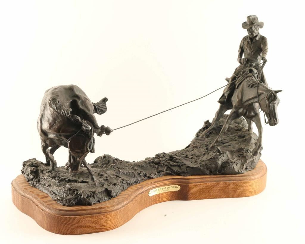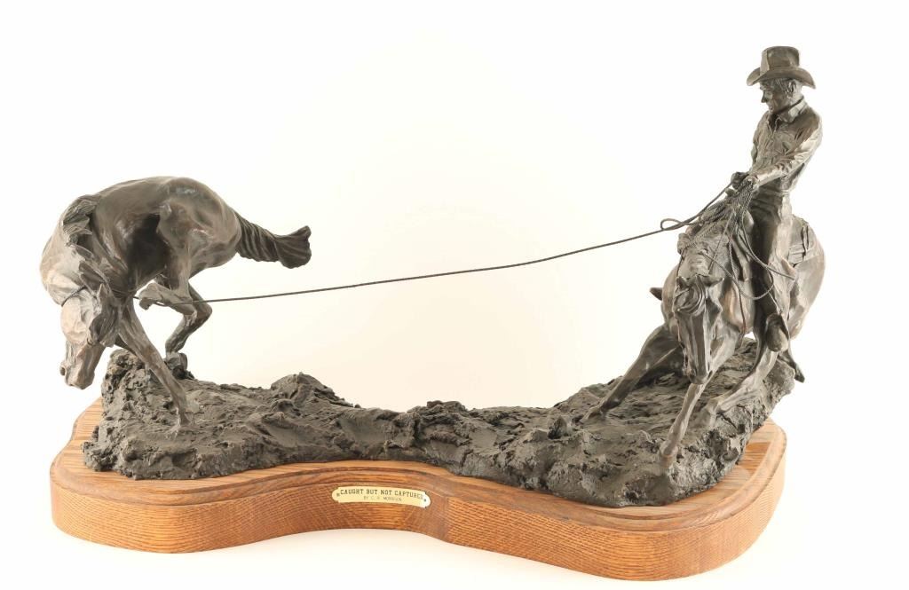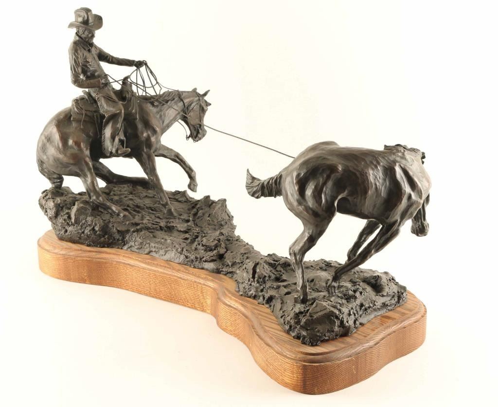 entitled "Caught but not Captured".Signed and numbered #5/20. Measures 23" x 15" x 11". Made in 1989. BIO-Clarence or C.R. Morrison is a world-renowned sculptor who was born at his family's homestead in the Sweet Grass Hills of north central Montana, a working cattle and sheep operation that eventually became a ranch of over 6000 acres. He presently lives with his wife on their ranch near Clyde Park, Montana. Morrison's work has been commissioned by galleries and collectors throughout the United States and the C.R. Morrison trophies and medals awarded by the American Quarter Horse Association and the National Reining Horse Association are among the most coveted in equine competition. His horse sculptures are considered among the most beautiful in the world and are noted for their expression of form and movement. Clarence is famous for his sculptures of horses, wildlife, and ranch scenes of the western United States.