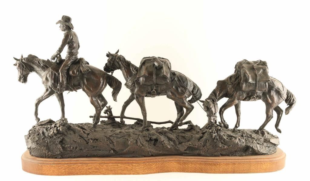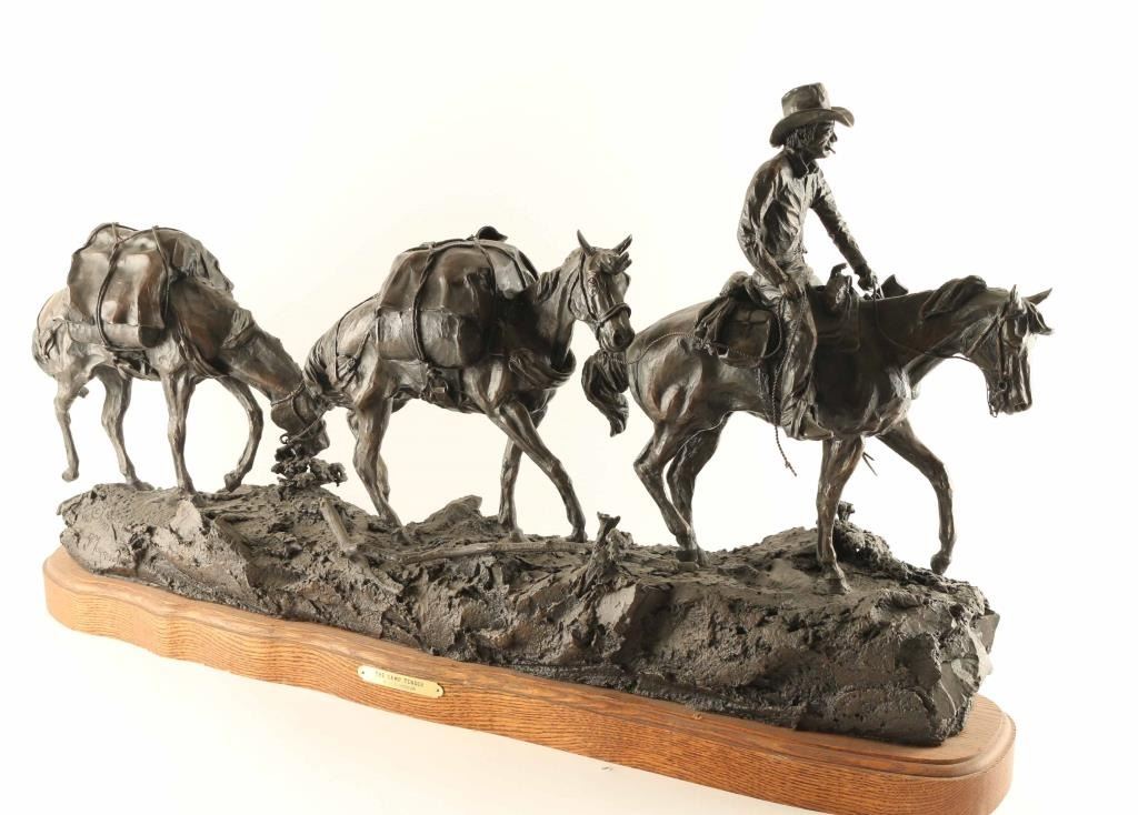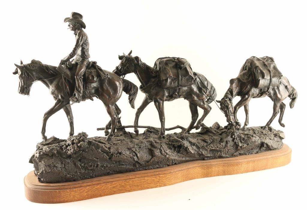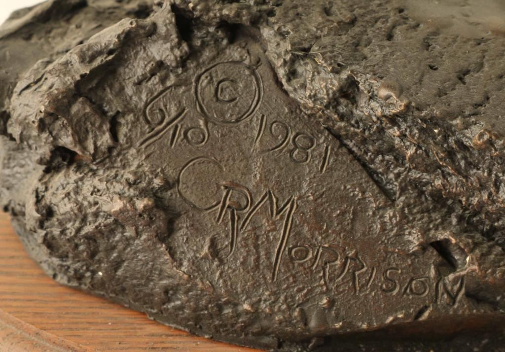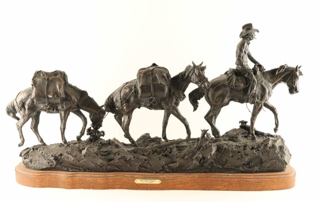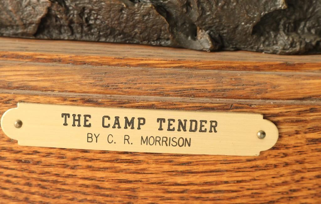 entitled "The Camp Tender", #6/10 numbered and signed on base. Piece measures 34" x 19" x 10". BIO- Clarence or C.R. Morrison is a world-renowned sculptor who was born at his family's homestead in the Sweet Grass Hills of north central Montana, a working cattle and sheep operation that eventually became a ranch of over 6000 acres. He presently lives with his wife on their ranch near Clyde Park, Montana. Morrison's work has been commissioned by galleries and collectors throughout the United States and the C.R. Morrison trophies and medals awarded by the American Quarter Horse Association and the National Reining Horse Association are among the most coveted in equine competition. His horse sculptures are considered among the most beautiful in the world and are noted for their expression of form and movement. Clarence is famous for his sculptures of horses, wildife, and ranch scenes of the western United States.