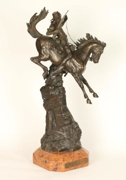 by world famous western artist Carl Kauba (1865-1922) entitled "For Death or Glory" hand signed. Measures 32"h x 10"w x 10"l. on marble base. Carl Kauba was an Austrian sculptor of Western American bronzes specializing in Indians. Kauba was the pupil of Carl Waschmann and Stefan Schwartz in Austria. He traveled widely in the American West, sketching and modeling, about 1895. He returned to Vienna where his Western bronzes were cast for the American market between 1895 and 1912. Small and medium bronzes were sometimes polychromed at the foundry. This is a highly collectable original bronze from a well noted western artist similar pieces have brought upwards of 50,000 in galleries.